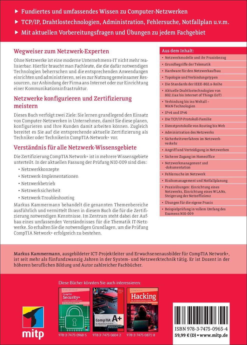 Markus Kammermann behandelt die genannten Themenbereiche ausführlich und vermittelt Ihnen in diesem Buch die für die Zertifizierung notwendigen Kenntnisse. Im Zentrum steht dabei der Aufbau eines umfassenden Verständnisses für die Thematik IT-Netzwerke. So erhalten Sie die notwendigen Grundlagen, um die Prüfung CompTIA Network+ erfolgreich zu bestehen.