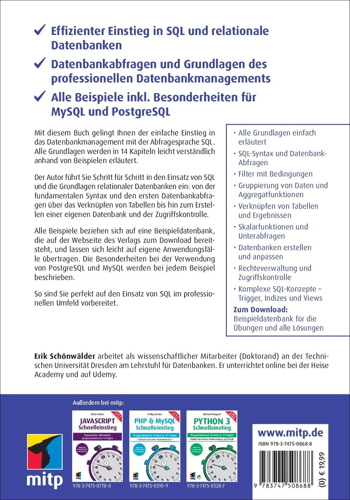 | Schlagworte | Anfänger • Buch • Datenbank • Datenbankmodell • Datenbankmodellierung • Datenbankprogrammierung • Einsteiger • Indizieren • mitp • MySQL • ohne Vorkenntnisse • PostgreSQL • Relationale Datenbanken • Schnelleinstieg • SQL • Tabelle |