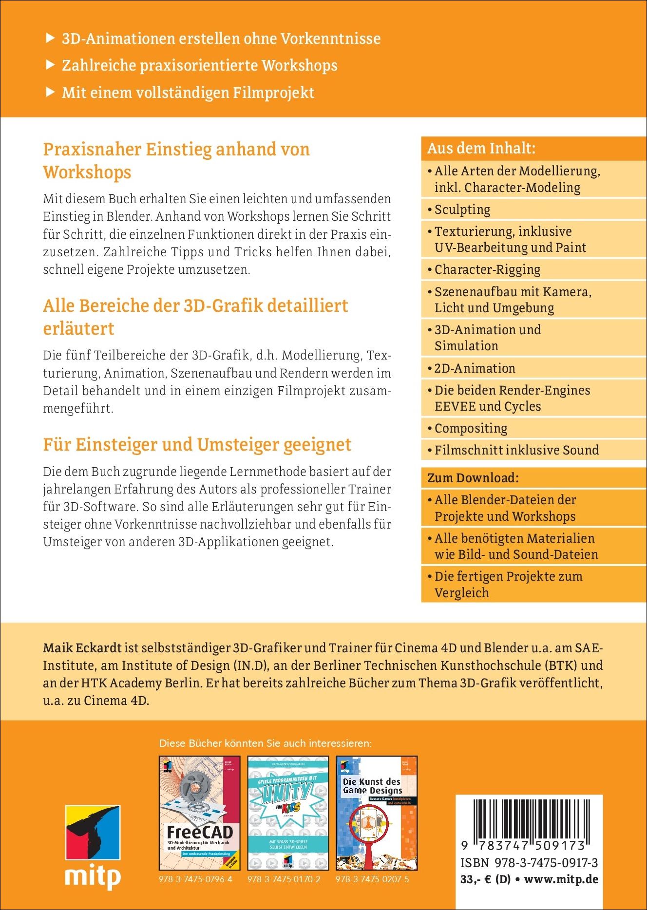 Mit diesem Buch erhalten Sie einen schnellen und leichten Einstieg in alle wesentliche Bereiche der 3D-Grafiksoftware Blender. Anhand von Workshops lernen Sie, die einzelnen Funktionen direkt in der Praxis einzusetzen. Zahlreiche Tipps und Tricks helfen dabei, schwierige Aufgaben zu meistern und Ihnen die Umsetzung eigener Projekte in der Zukunft zu erleichtern. Die zugrunde liegende Lernmethode basiert auf der jahrelangen (mittlerweile jahrzehnte :o) Erfahrung des Autors als Trainer und professioneller 3D-Grafiker.