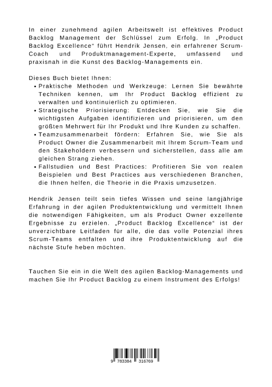 In einer zunehmend agilen Arbeitswelt ist effektives Product Backlog Management der Schlüssel zum Erfolg. In "Product Backlog Excellence" führt Hendrik Jensen, ein erfahrener Scrum-Coach und Produktmanagement-Experte, umfassend und praxisnah in die Kunst des Backlog-Managements ein.Dieses Buch bietet Ihnen:Praktische Methoden und Werkzeuge: Lernen Sie bewährte Techniken kennen, um Ihr Product Backlog effizient zu verwalten und kontinuierlich zu optimieren.Strategische Priorisierung: Entdecken Sie, wie Sie die wichtigsten Aufgaben identifizieren und priorisieren, um den größten Mehrwert für Ihr Produkt und Ihre Kunden zu schaffen.Teamzusammenarbeit fördern: Erfahren Sie, wie Sie als Product Owner die Zusammenarbeit mit Ihrem Scrum-Team und den Stakeholdern verbessern und sicherstellen, dass alle am gleichen Strang ziehen.Fallstudien und Best Practices: Profitieren Sie von realen Beispielen und Best Practices aus verschiedenen Branchen, die Ihnen helfen, die Theorie in die Praxis umzusetzen.Hendrik Jensen teilt sein tiefes Wissen und seine langjährige Erfahrung in der agilen Produktentwicklung und vermittelt Ihnen die notwendigen Fähigkeiten, um als Product Owner exzellente Ergebnisse zu erzielen. "Product Backlog Excellence" ist der unverzichtbare Leitfaden für alle, die das volle Potenzial ihres Scrum-Teams entfalten und ihre Produktentwicklung auf die nächste Stufe heben möchten.Tauchen Sie ein in die Welt des agilen Backlog-Managements und machen Sie Ihr Product Backlog zu einem Instrument des Erfolgs!