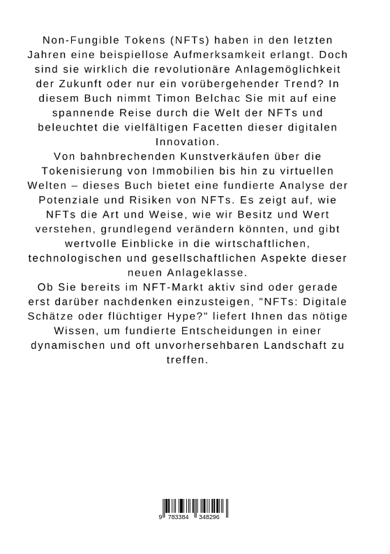 Non-Fungible Tokens (NFTs) haben in den letzten Jahren eine beispiellose Aufmerksamkeit erlangt. Doch sind sie wirklich die revolutionäre Anlagemöglichkeit der Zukunft oder nur ein vorübergehender Trend? In diesem Buch nimmt Timon Belchac Sie mit auf eine spannende Reise durch die Welt der NFTs und beleuchtet die vielfältigen Facetten dieser digitalen Innovation.Von bahnbrechenden Kunstverkäufen über die Tokenisierung von Immobilien bis hin zu virtuellen Welten - dieses Buch bietet eine fundierte Analyse der Potenziale und Risiken von NFTs. Es zeigt auf, wie NFTs die Art und Weise, wie wir Besitz und Wert verstehen, grundlegend verändern könnten, und gibt wertvolle Einblicke in die wirtschaftlichen, technologischen und gesellschaftlichen Aspekte dieser neuen Anlageklasse.Ob Sie bereits im NFT-Markt aktiv sind oder gerade erst darüber nachdenken einzusteigen, "NFTs: Digitale Schätze oder flüchtiger Hype?" liefert Ihnen das nötige Wissen, um fundierte Entscheidungen in einer dynamischen und oft unvorhersehbaren Landschaft zu treffen.