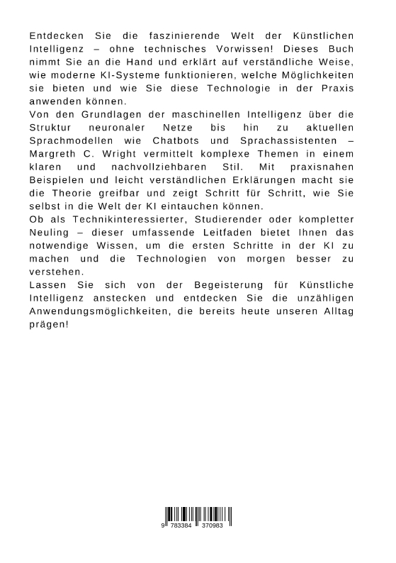 Entdecken Sie die faszinierende Welt der Künstlichen Intelligenz - ohne technisches Vorwissen! Dieses Buch nimmt Sie an die Hand und erklärt auf verständliche Weise, wie moderne KI-Systeme funktionieren, welche Möglichkeiten sie bieten und wie Sie diese Technologie in der Praxis anwenden können.Von den Grundlagen der maschinellen Intelligenz über die Struktur neuronaler Netze bis hin zu aktuellen Sprachmodellen wie Chatbots und Sprachassistenten - Margreth C. Wright vermittelt komplexe Themen in einem klaren und nachvollziehbaren Stil. Mit praxisnahen Beispielen und leicht verständlichen Erklärungen macht sie die Theorie greifbar und zeigt Schritt für Schritt, wie Sie selbst in die Welt der KI eintauchen können.Ob als Technikinteressierter, Studierender oder kompletter Neuling - dieser umfassende Leitfaden bietet Ihnen das notwendige Wissen, um die ersten Schritte in der KI zu machen und die Technologien von morgen besser zu verstehen.Lassen Sie sich von der Begeisterung für Künstliche Intelligenz anstecken und entdecken Sie die unzähligen Anwendungsmöglichkeiten, die bereits heute unseren Alltag prägen!