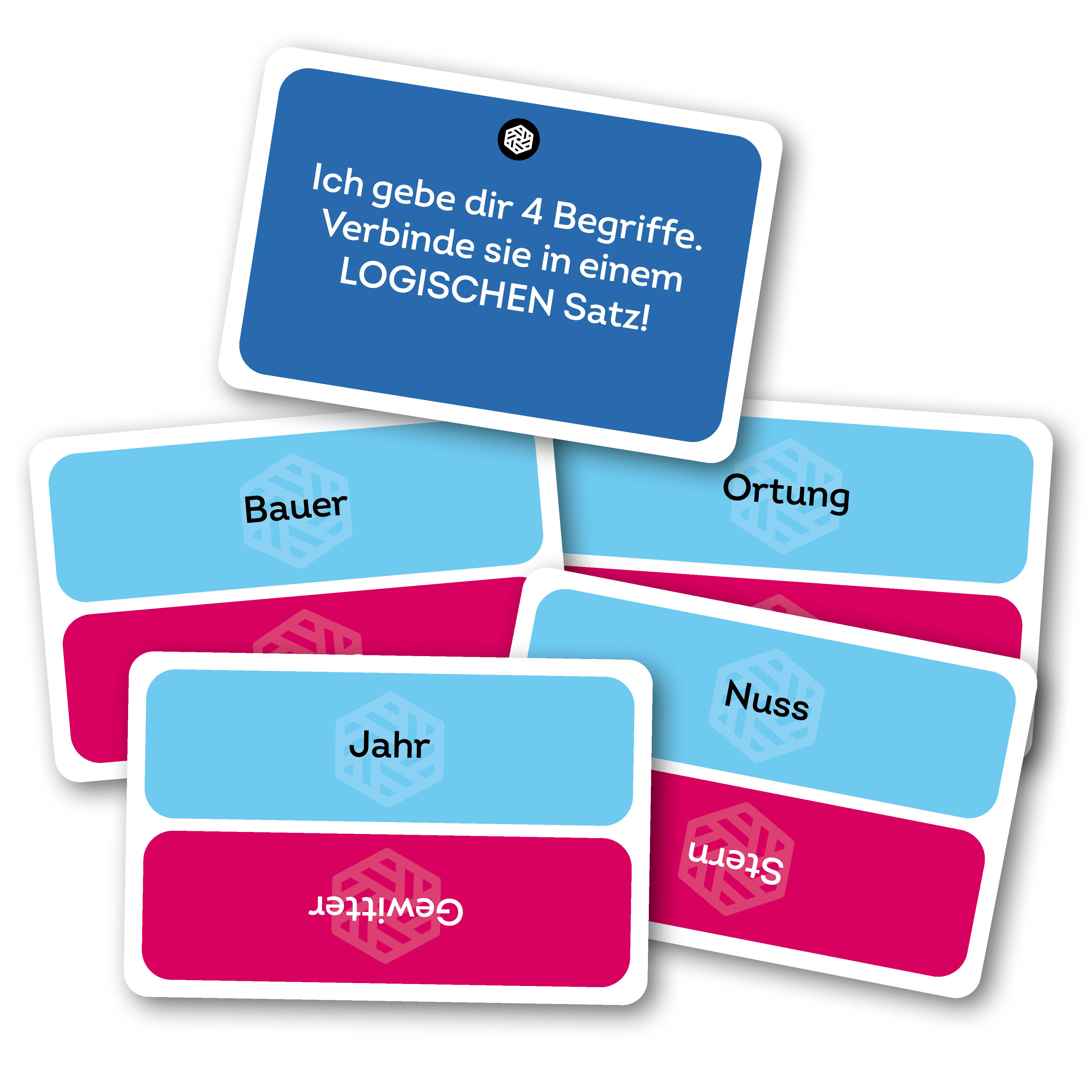 Die Gruppe zieht vier Karten mit Begriffen. Alle am Tisch denken sich einen Satz aus, der diese Begriffe möglichst kreativ oder witzig kombiniert. ChatGPT wird mit derselben Aufgabe programmiert und die vier Begriffe werden eingegeben. Dann werden die Antworten aller Spielenden und ChatGPT vorgelesen. Die Gruppe stimmt ab, wer die beste Antwort gefunden hat: Mensch oder KI. Im späteren Spiel kann die Aufgabenstellung durch zufällig gezogene Emotionskarten weiter verändert werden.
