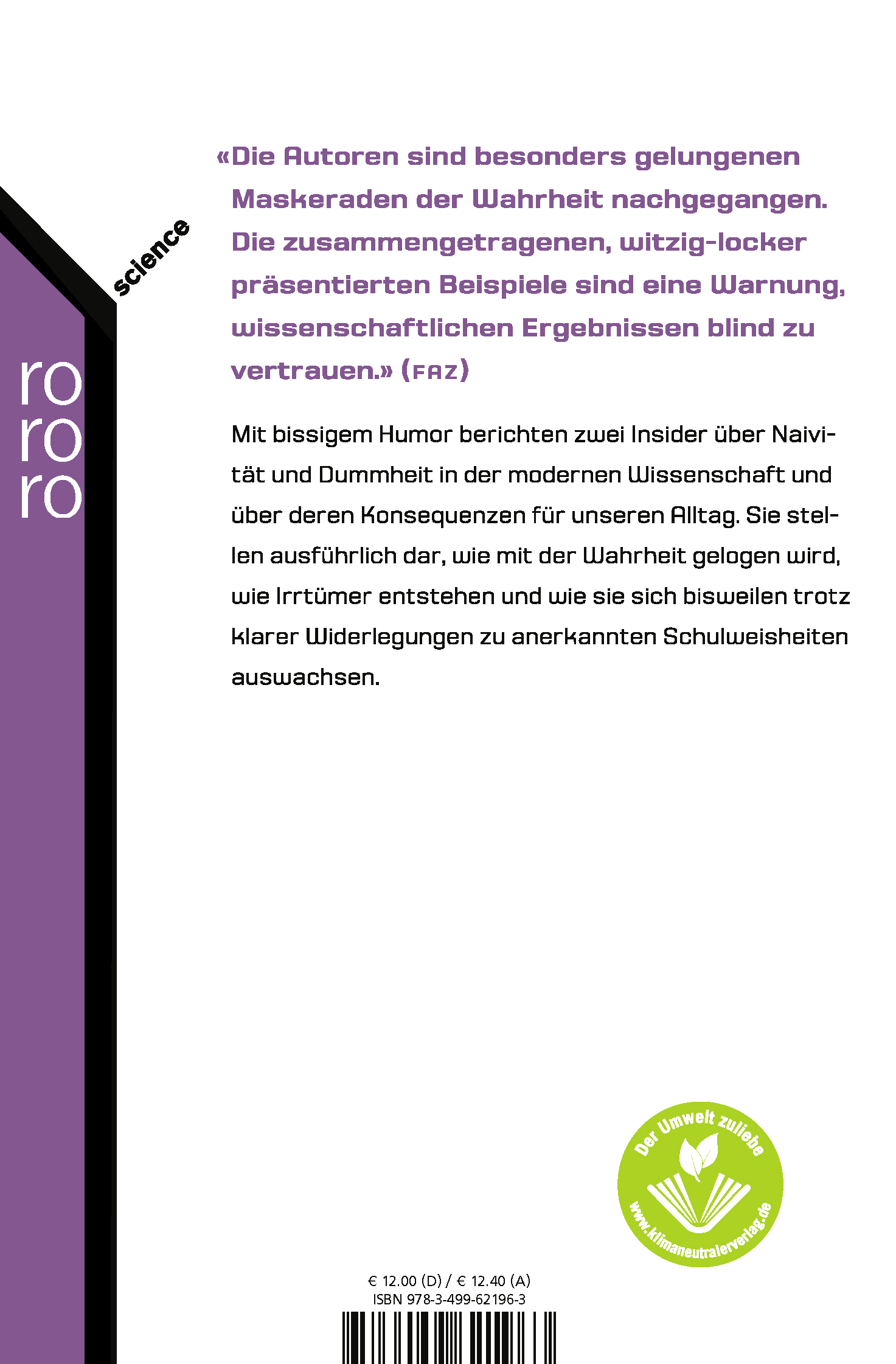 Mit bissigem Humor berichten zwei Insider über Naivität und Dummheit in der modernen Wissenschaft und über deren Konsequenzen für unseren Alltag. Sie stellen ausführlich dar, wie mit der Wahrheit gelogen wird, wie Irrtümer entstehen und wie sie sich bisweilen trotz klarer Widerlegungen zu anerkannten Schulweisheiten auswachsen.