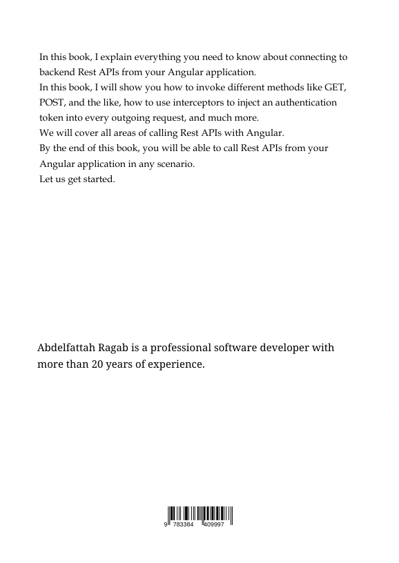 In this book, I explain everything you need to know about connecting to backend Rest APIs from your Angular application.In this book, I will show you how to invoke different methods like GET, POST, and the like, how to use interceptors to inject an authentication token into every outgoing request, and much more.We will cover all areas of calling Rest APIs with Angular.By the end of this book, you will be able to call Rest APIs from your Angular application in any scenario.Let us get started.