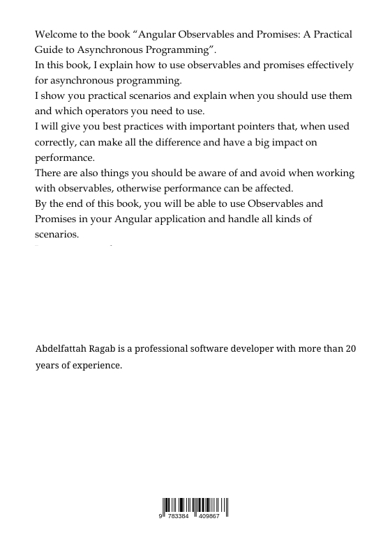 Welcome to the book "Angular Observables and Promises: A Practical Guide to Asynchronous Programming".In this book, I explain how to use observables and promises effectively for asynchronous programming.I show you practical scenarios and explain when you should use them and which operators you need to use.I will give you best practices with important pointers that, when used correctly, can make all the difference and have a big impact on performance.There are also things you should be aware of and avoid when working with observables, otherwise performance can be affected.By the end of this book, you will be able to use Observables and Promises in your Angular application and handle all kinds of scenarios.Let us get started.