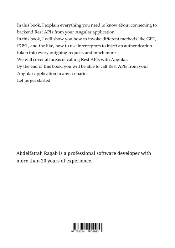 In this book, I explain everything you need to know about connecting to backend Rest APIs from your Angular application.In this book, I will show you how to invoke different methods like GET, POST, and the like, how to use interceptors to inject an authentication token into every outgoing request, and much more.We will cover all areas of calling Rest APIs with Angular.By the end of this book, you will be able to call Rest APIs from your Angular application in any scenario.Let us get started.