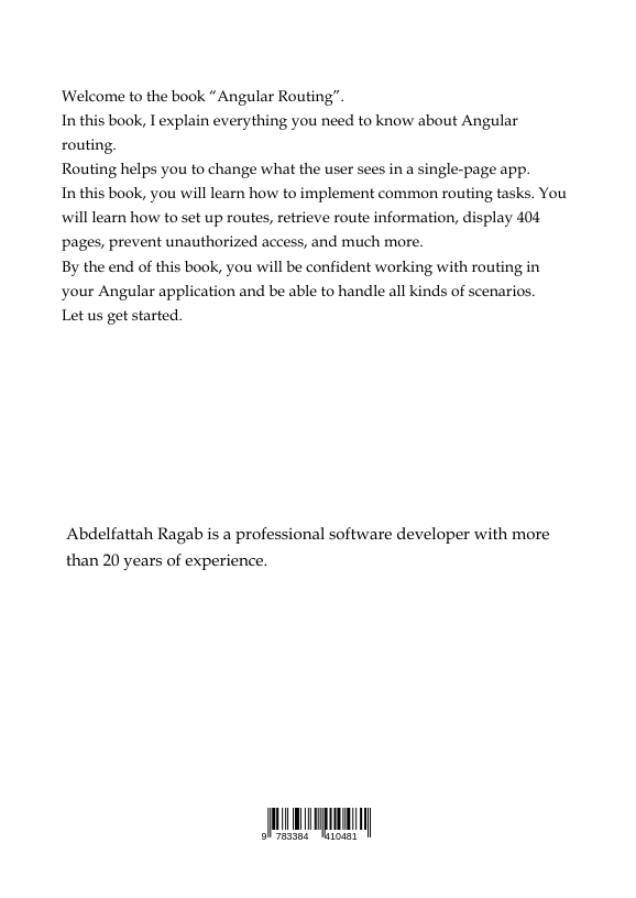 Welcome to the book "Angular Routing".In this book, I explain everything you need to know about Angular routing.Routing helps you to change what the user sees in a single-page app.In this book, you will learn how to implement common routing tasks. You will learn how to set up routes, retrieve route information, display 404 pages, prevent unauthorized access, and much more.By the end of this book, you will be confident working with routing in your Angular application and be able to handle all kinds of scenarios.Let us get started.