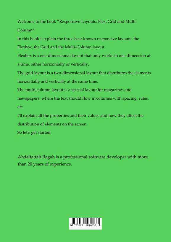 Hello, I am Abdelfattah Ragab, a professional software developer with more than 20 years of experience. I am an expert in Angular, CSS, graphic design and all web related technologies. I have published numerous books on modern CSS layouts and Angular as well as complete business solutions for e-commerce and the like. I hope you enjoy my books. With kind regards.