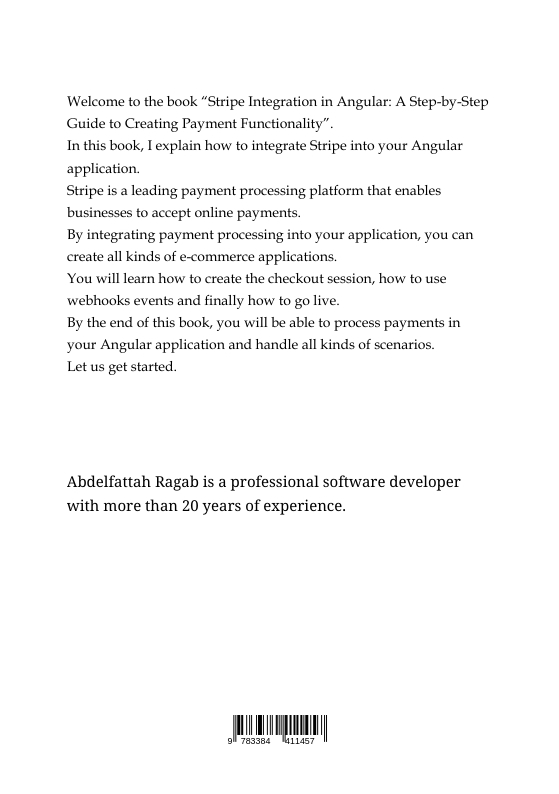 Welcome to the book "Stripe Integration in Angular: A Step-by-Step Guide to Creating Payment Functionality".In this book, I explain how to integrate Stripe into your Angular application.Stripe is a leading payment processing platform that enables businesses to accept online payments.By integrating payment processing into your application, you can create all kinds of e-commerce applications.You will learn how to create the checkout session, how to use webhooks events and finally how to go live.By the end of this book, you will be able to process payments in your Angular application and handle all kinds of scenarios.Let us get started.