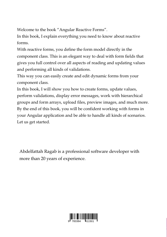Welcome to the book "Angular Reactive Forms".In this book, I explain everything you need to know about reactive forms.With reactive forms, you define the form model directly in the component class. This is an elegant way to deal with form fields that gives you full control over all aspects of reading and updating values and performing all kinds of validations.This way you can easily create and edit dynamic forms from your component class.In this book, I will show you how to create forms, update values, perform validations, display error messages, work with hierarchical groups and form arrays, upload files, preview images, and much more.By the end of this book, you will be confident working with forms in your Angular application and be able to handle all kinds of scenarios.Let us get started.