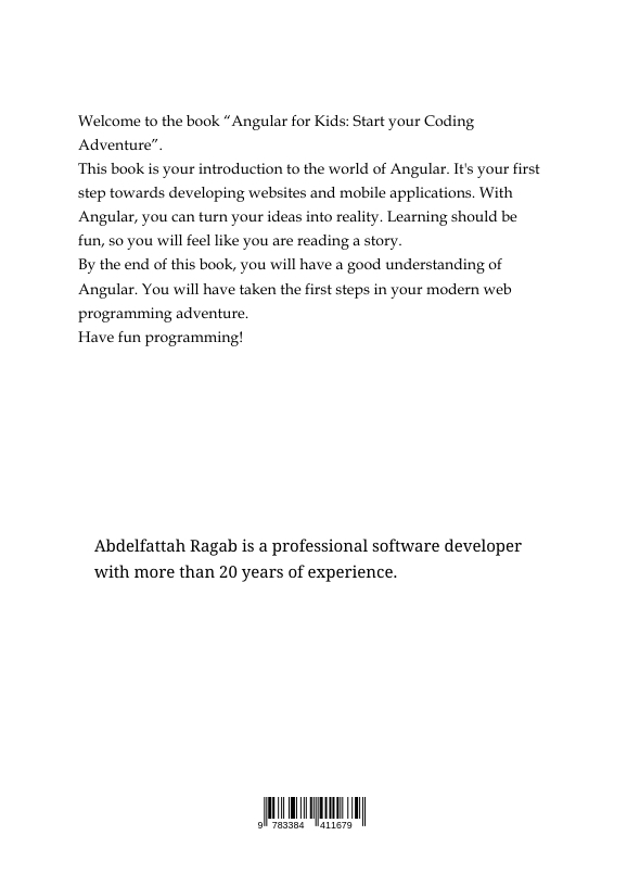 Welcome to the book "Angular for Kids: Start your Coding Adventure".This book is your introduction to the world of Angular. It's your first step towards developing websites and mobile applications. With Angular, you can turn your ideas into reality. Learning should be fun, so you will feel like you are reading a story.By the end of this book, you will have a good understanding of Angular. You will have taken the first steps in your modern web programming adventure.Have fun programming!