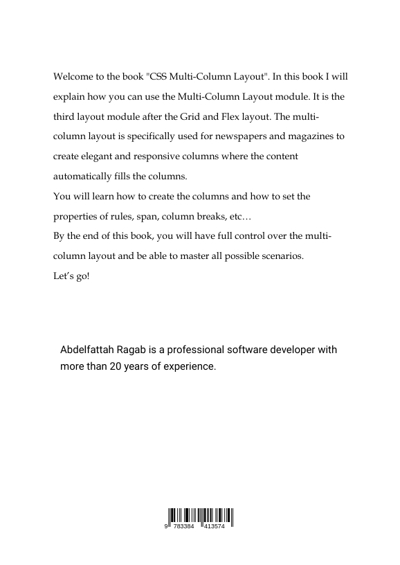 Welcome to "CSS Multi-Column Layout". In this book, you'll learn how to use the Multi-Column Layout module to create elegant and responsive multi-column layouts used in newspapers and magazines.