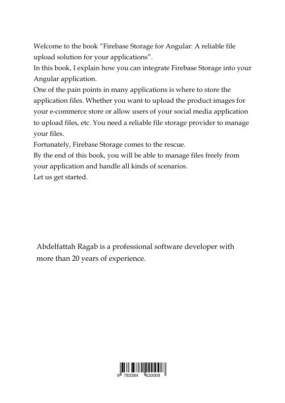 Welcome to the book "Firebase Storage for Angular: A reliable file upload solution for your applications".In this book, I explain how you can integrate Firebase Storage into your Angular application.One of the pain points in many applications is where to store the application files. Whether you want to upload the product images for your e-commerce store or allow users of your social media application to upload files, etc. You need a reliable file storage provider to manage your files.Fortunately, Firebase Storage comes to the rescue.By the end of this book, you will be able to manage files freely from your application and handle all kinds of scenarios.Let us get started.