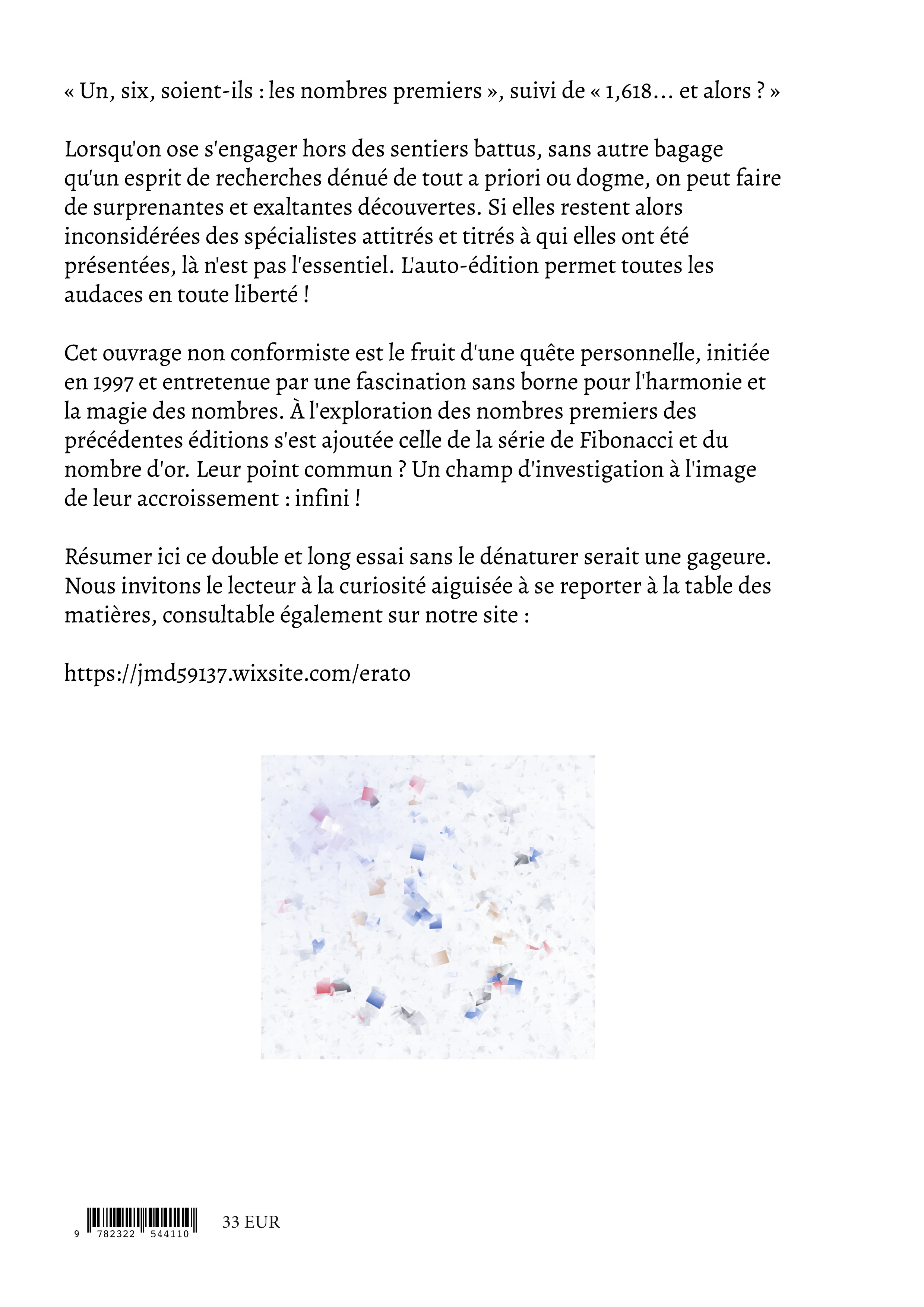 Cet ouvrage non conformiste est le fruit d'une quête personnelle, initiée en 1997 et entretenue par une fascination sans borne pour l'harmonie et la magie des nombres. À l'exploration des nombres premiers des précédentes éditions s'est ajoutée celle de la série de Fibonacci et du nombre d'or. Leur point commun ? Un champ d'investigation à l'image de leur accroissement : infini !