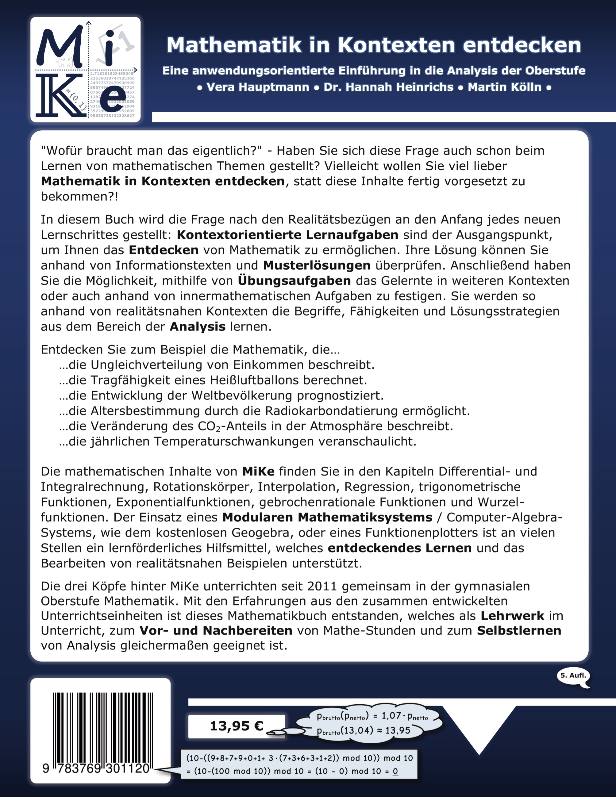 Die Köpfe hinter MiKe: Die drei Autor/innen unterrichten seit 2011 gemeinsam in der gymnasialen Oberstufe Mathematik. Mit den Erfahrungen aus den zusammen entwickelten Unterrichtseinheiten ist dieses Mathematikbuch entstanden, welches als Lehrwerk im Unterricht, zum Vor- und Nachbereiten von Mathe-Stunden und zum Selbstlernen von Analysis gleichermaßen geeignet ist.