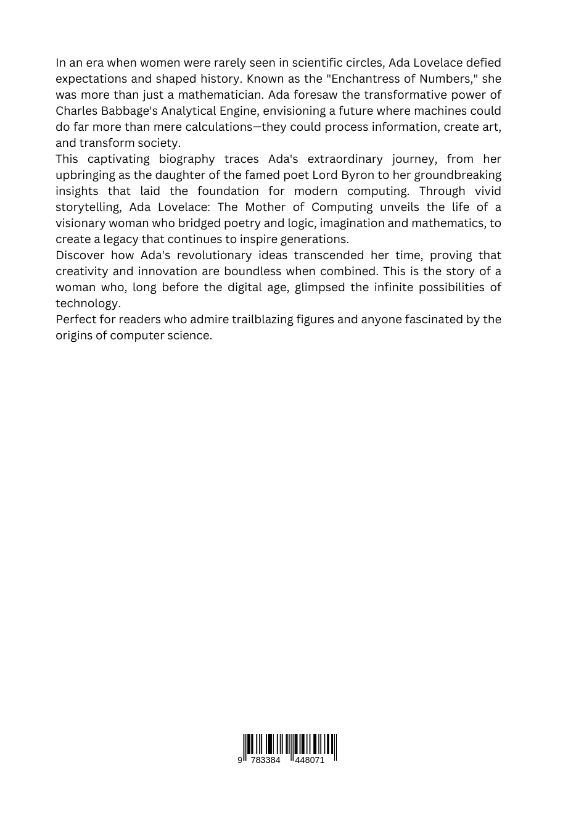 In an era when women were rarely seen in scientific circles, Ada Lovelace defied expectations and shaped history. Known as the "Enchantress of Numbers," she was more than just a mathematician. Ada foresaw the transformative power of Charles Babbage's Analytical Engine, envisioning a future where machines could do far more than mere calculations-they could process information, create art, and transform society.This captivating biography traces Ada's extraordinary journey, from her upbringing as the daughter of the famed poet Lord Byron to her groundbreaking insights that laid the foundation for modern computing. Through vivid storytelling, Ada Lovelace: The Mother of Computing unveils the life of a visionary woman who bridged poetry and logic, imagination and mathematics, to create a legacy that continues to inspire generations.Discover how Ada's revolutionary ideas transcended her time, proving that creativity and innovation are boundless when combined. This is the story of a woman who, long before the digital age, glimpsed the infinite possibilities of technology.Perfect for readers who admire trailblazing figures and anyone fascinated by the origins of computer science.