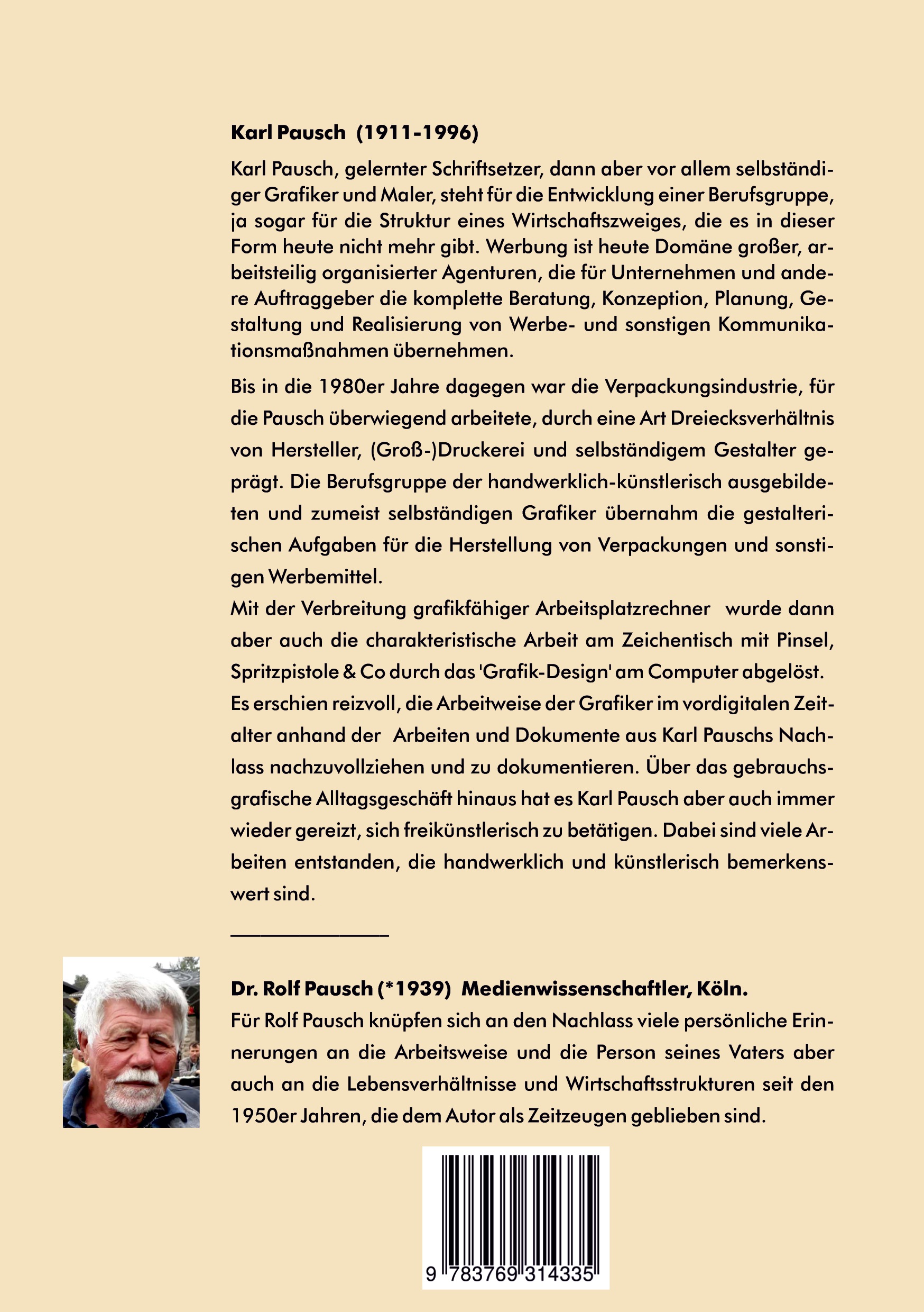 Dr. Rolf Pausch (*1939), Medienwissenschaftler, Köln. Ingenieur- und kulturwissenschaftlivhes Studium | medienbezogene Tätigkeit in verschiedenen Forschungseinrichtungen (Zentrum für Interdisziplinäre Forschung, Bielefeld; Bildungstechnologisches Zentrum, Wiesbaden; Max-Planck-Institut für Psychiatrie, München) | 1979 bis1983 fachliche Leitung des Audiovisuellen Medienzentrums an der RWTH Aachen | 1983 bis 2004 Leiter des Audiovisuellen Medienzentrums (AVMZ) der Universität zu Köln. Nach dem Ausscheiden aus dem Universitätsdienst fachliche und private Publikationsprojekte. Für Rolf Pausch knüpfen sich an den Nachlass viele persönliche Erinnerungen an die Arbeitsweise und die Person seines Vaters, aber auch an die Lebensverhältnisse und Wirtschaftsstrukturen seit den 1950er Jahren, die dem Autor als Zeitzeugen geblieben sind.