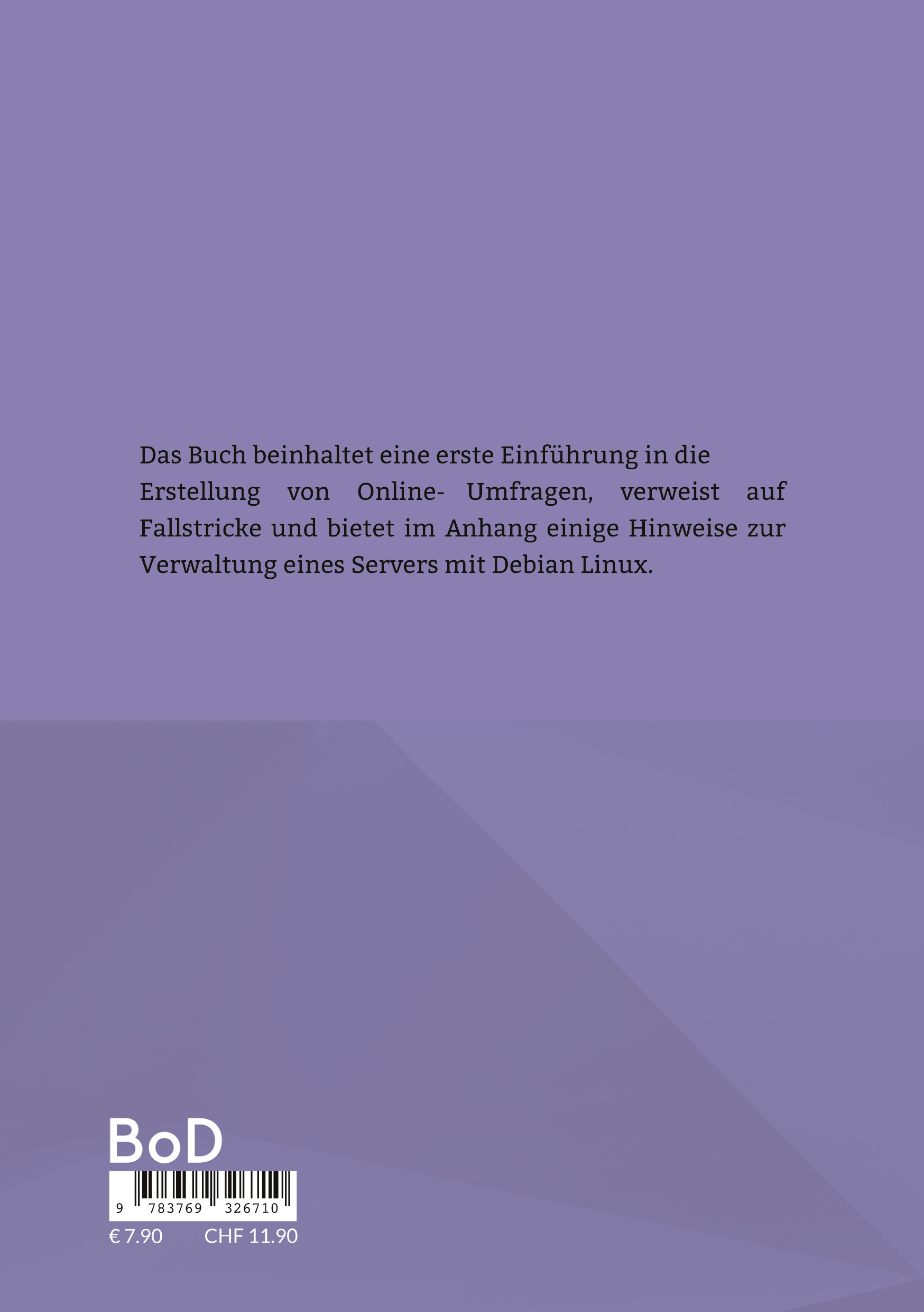 Das Buch beinhaltet eine erste Einführung in die Erstellung von Online-Umfragen, verweist auf Fallstricke und bietet im Anhang einige Hinweise zur Verwaltung eines Servers mit Debian Linux.