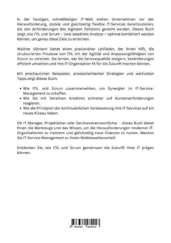 In der heutigen, schnelllebigen IT-Welt stehen Unternehmen vor der Herausforderung, stabile und gleichzeitig flexible IT-Services bereitzustellen, die den Anforderungen des digitalen Zeitalters gerecht werden. Dieses Buch zeigt, wie ITIL und Scrum - zwei bewährte Ansätze - optimal kombiniert werden können, um genau diese Ziele zu erreichen.Walther Ullmann bietet einen praxisnahen Leitfaden, der Ihnen hilft, die strukturierten Prozesse von ITIL mit der Agilität und Anpassungsfähigkeit von Scrum zu vereinen. Sie lernen, wie Sie Servicequalität steigern, Veränderungen effizient umsetzen und Ihre IT-Organisation fit für die Zukunft machen können.Mit anschaulichen Beispielen, praxisorientierten Strategien und wertvollen Tipps zeigt dieses Buch:Wie ITIL und Scrum zusammenwirken, um Synergien im IT-Service-Management zu schaffen.Wie Sie mit iterativen Ansätzen schneller auf Kundenanforderungen reagieren.Wie die Prinzipien der kontinuierlichen Verbesserung Ihre IT-Services auf ein neues Niveau heben.Ob IT-Manager, Projektleiter oder Serviceverantwortlicher - dieses Buch bietet Ihnen die Werkzeuge und das Wissen, um die Herausforderungen moderner IT-Organisationen zu meistern und gleichzeitig neue Chancen zu nutzen. Machen Sie IT-Service-Management zu Ihrem Wettbewerbsvorteil!Entdecken Sie, wie ITIL und Scrum gemeinsam die Zukunft Ihrer IT prägen können.