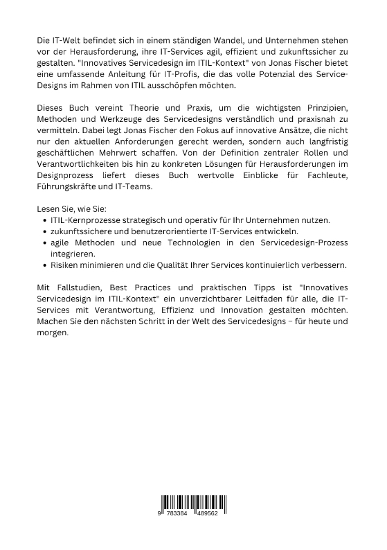 Die IT-Welt befindet sich in einem ständigen Wandel, und Unternehmen stehen vor der Herausforderung, ihre IT-Services agil, effizient und zukunftssicher zu gestalten. "Innovatives Servicedesign im ITIL-Kontext" von Jonas Fischer bietet eine umfassende Anleitung für IT-Profis, die das volle Potenzial des Service-Designs im Rahmen von ITIL aus-schöpfen möchten.Dieses Buch vereint Theorie und Praxis, um die wichtigsten Prinzipien, Methoden und Werkzeuge des Servicedesigns verständlich und praxisnah zu vermitteln. Dabei legt Jonas Fischer den Fokus auf innovative Ansätze, die nicht nur den aktuellen Anforderungen gerecht werden, sondern auch langfristig geschäftlichen Mehrwert schaffen. Von der Definition zentraler Rollen und Verantwortlichkeiten bis hin zu konkreten Lösungen für Herausforderungen im Designprozess liefert dieses Buch wertvolle Einblicke für Fachleute, Führungskräfte und IT-Teams.Lesen Sie, wie Sie:ITIL-Kernprozesse strategisch und operativ für Ihr Unternehmen nutzen.zukunftssichere und benutzerorientierte IT-Services entwickeln.agile Methoden und neue Technologien in den Servicedesign-Prozess integrieren.Risiken minimieren und die Qualität Ihrer Services kontinuierlich verbessern.Mit Fallstudien, Best Practices und praktischen Tipps ist "Innovatives Servicedesign im ITIL-Kontext" ein unverzichtbarer Leitfaden für alle, die IT-Services mit Verantwortung, Effizienz und Innovation gestalten möchten. Machen Sie den nächsten Schritt in der Welt des Servicedesigns - für heute und morgen.