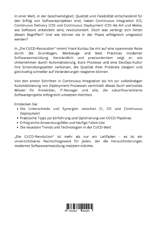 In einer Welt, in der Geschwindigkeit, Qualität und Flexibilität entscheidend für den Erfolg von Softwareprojekten sind, haben Continuous Integration (CI), Continuous Delivery (CD) und Continuous Deployment (CD) die Art und Weise, wie Software entwickelt wird, revolutioniert. Doch was verbirgt sich hinter diesen Begriffen? Und wie können sie in der Praxis erfolgreich umgesetzt werden?In "Die CI/CD-Revolution" nimmt Frank Kuhlau Sie mit auf eine spannende Reise durch die Grundlagen, Werkzeuge und Best Practices moderner Softwareentwicklung. Verständlich und praxisorientiert zeigt er, wie Unternehmen durch Automatisierung, klare Prozesse und eine DevOps-Kultur ihre Entwicklungszeiten verkürzen, die Qualität ihrer Produkte steigern und gleichzeitig schneller auf Veränderungen reagieren können.Von den ersten Schritten in Continuous Integration bis hin zur vollständigen Automatisierung von Deployment-Prozessen vermittelt dieses Buch wertvolles Wissen für Entwickler, IT-Manager und alle, die zukunftsorientierte Softwareprojekte erfolgreich umsetzen möchten.Entdecken Sie:Die Unterschiede und Synergien zwischen CI, CD und Continuous DeploymentPraktische Tipps zur Einführung und Optimierung von CI/CD-PipelinesErfolgreiche Anwendungsfälle und häufige FallstrickeDie neuesten Trends und Technologien in der CI/CD-Welt"Die CI/CD-Revolution" ist mehr als nur ein Leitfaden - es ist ein unverzichtbares Nachschlagewerk für jeden, der die Herausforderungen moderner Softwareentwicklung meistern möchte.