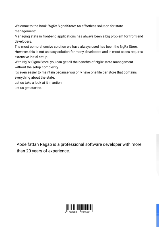 Welcome to the book "NgRx SignalStore: An effortless solution for state management".Managing state in front-end applications has always been a big problem for front-end developers.The most comprehensive solution we have always used has been the NgRx Store. However, this is not an easy solution for many developers and in most cases requires extensive initial setup.With NgRx SignalStore, you can get all the benefits of NgRx state management without the setup complexity.It's even easier to maintain because you only have one file per store that contains everything about the state.Let us take a look at it in action.Let us get started.