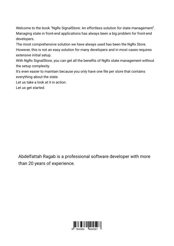 Welcome to the book "NgRx SignalStore: An effortless solution for state management".Managing state in front-end applications has always been a big problem for front-end developers.The most comprehensive solution we have always used has been the NgRx Store. However, this is not an easy solution for many developers and in most cases requires extensive initial setup.With NgRx SignalStore, you can get all the benefits of NgRx state management without the setup complexity.It's even easier to maintain because you only have one file per store that contains everything about the state.Let us take a look at it in action.Let us get started.