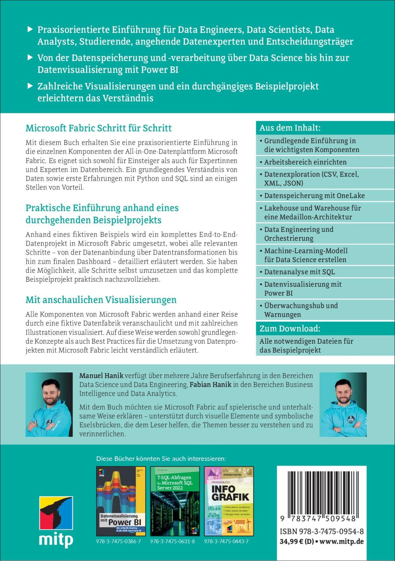 Manuel Hanik verfügt über mehrere Jahre Berufserfahrung in den Bereichen Data Science und Data Engineering, Fabian Hanik in den Bereichen Business Intelligence und Data Analytics. Beide Autoren haben bereits mehrere Datenprojekte in der Finanz- und Automobilbranche sowie im E-Commerce umgesetzt. Mit dem Buch möchten sie Microsoft Fabric auf spielerische und unterhaltsame Weise erklären – unterstützt durch visuelle Elemente und symbolische Eselsbrücken, die dem Leser helfen, die Themen besser zu verstehen und zu verinnerlichen.