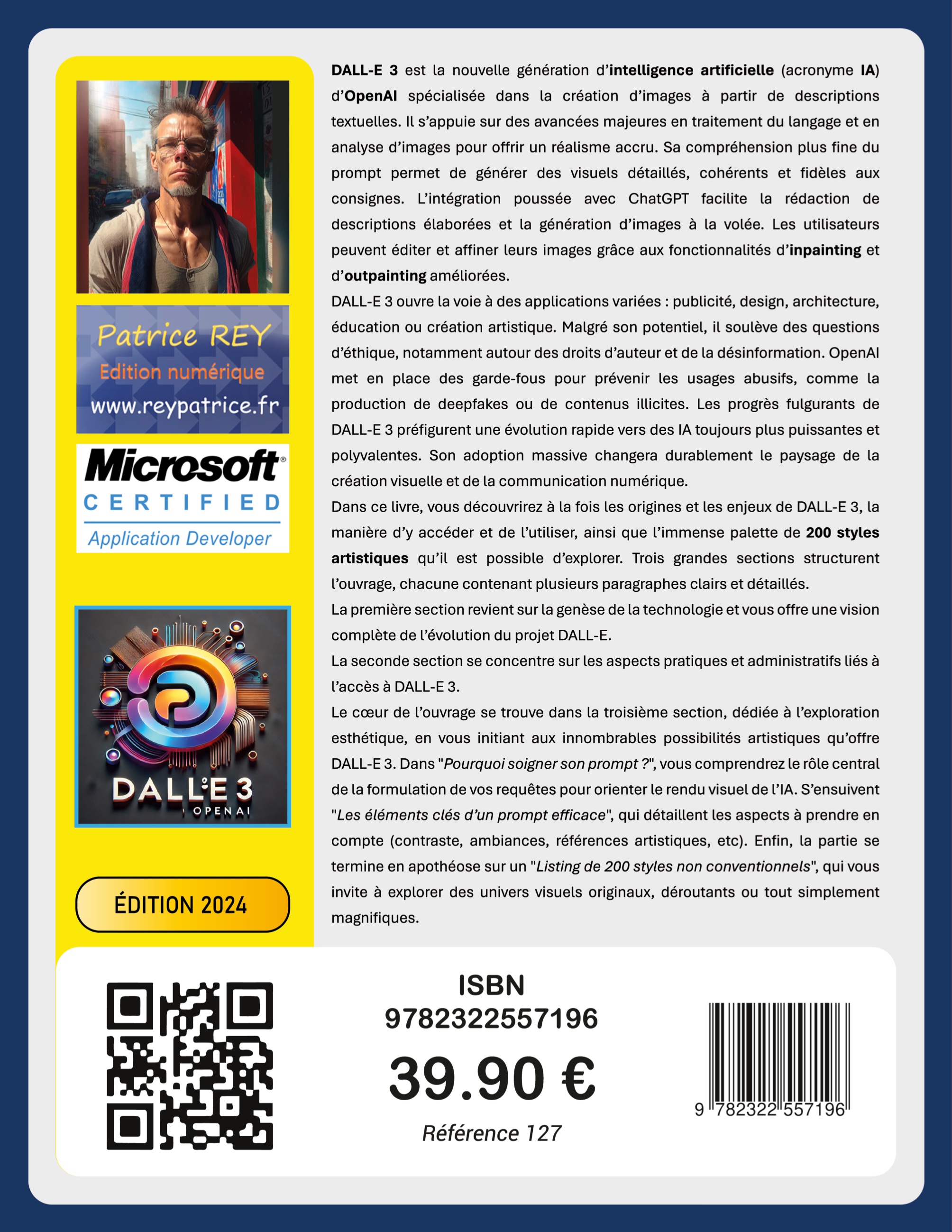 Dans ce livre, vous découvrirez à la fois les origines et les enjeux de DALL-E 3, la manière d'y accéder et de l'utiliser, ainsi que l'immense palette de 200 styles artistiques qu'il est possible d'explorer. Trois grandes sections structurent l'ouvrage, chacune contenant plusieurs paragraphes clairs et détaillés.