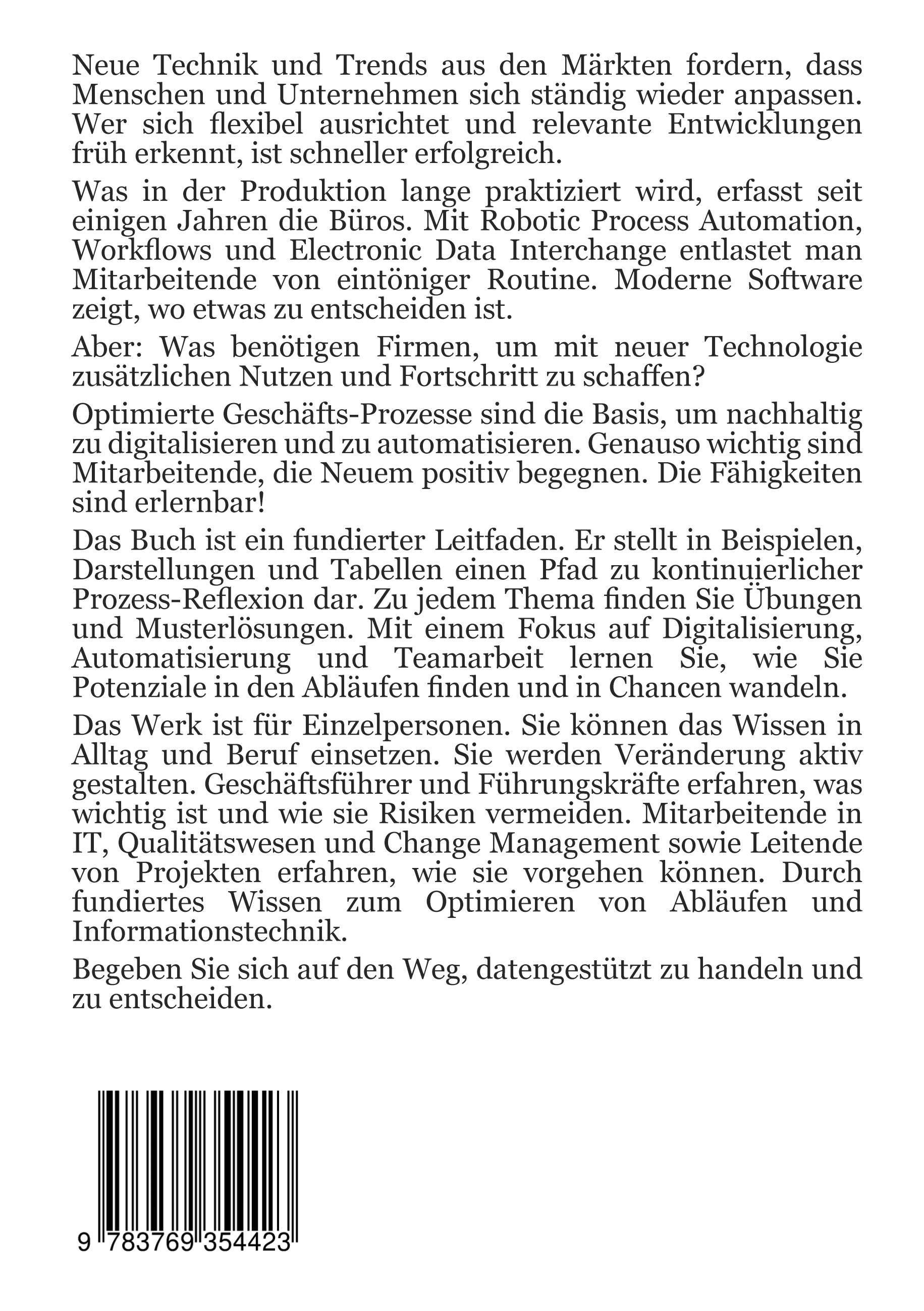 Das Buch ist ein fundierter Leitfaden. Er stellt in Beispielen, Darstellungen und Tabellen einen Pfad zu kontinuierlicher Prozess-Reflexion dar. Zu jedem Thema finden Sie Übungen und Musterlösungen. Mit einem Fokus auf Digitalisierung, Automatisierung und Teamarbeit lernen Sie, wie Sie Potenziale in den Abläufen finden und in Chancen wandeln.