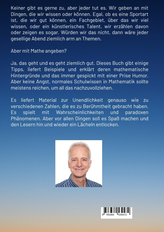 Niemand würde freiwillig zugeben, ein Angeber zu sein, aber alle tun es mehr oder weniger auffällig. Das ist gut so, man stelle sich einen geselligen Abend mit Freunden oder Kollegen vor, an dem wirklich niemand auch nur ein bisschen angibt. Viele Gesprächsthemen bleiben nicht mehr. Wir geben mit Fähigkeiten und Wissen an, aber mit Mathe? Erklären die meisten Menschen nicht, dass sie eher schlecht darin waren und nichts mehr davon wissen wollen? Das Buch zeigt zahlreiche Wege, um mit diesem Thema zu verschiedenen Anlässen zu glänzen. Es betrachtet interessante Zahlen (oder wissen Sie schon, warum die 73 besonders ist), schildert paradoxe Phänomene, die mit unserer menschlichen Intuition unvereinbar scheinen, zeigt, was in der Unendlichkeit wirklich passiert und bereitet Material auf, mit denen Sie langweilige Parties aufmöbeln können. Vor allem aber nimmt der Autor sich und die Mathematik nicht immer ernst und regt zum Schmunzeln und Fantasieren an. Das Buch soll ja in erster Linie Spaß machen. Aber keine Angst, die Mathematik in diesem Buch ist mit normalem Schulwissen meistens gut nachvollziehbar.