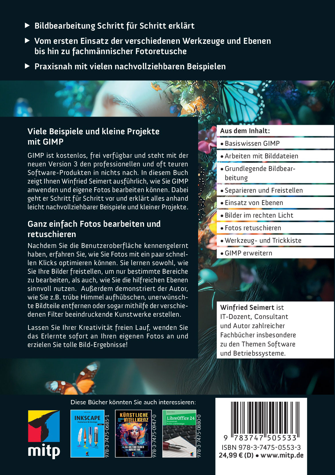 | Schlagworte | Bildbearbeitung • Bildretusche • Buch • Foto • GIMP • Gimp 3 • gimp buch • Mac • mitp • Photoshop • Retusche • WINDOWS |