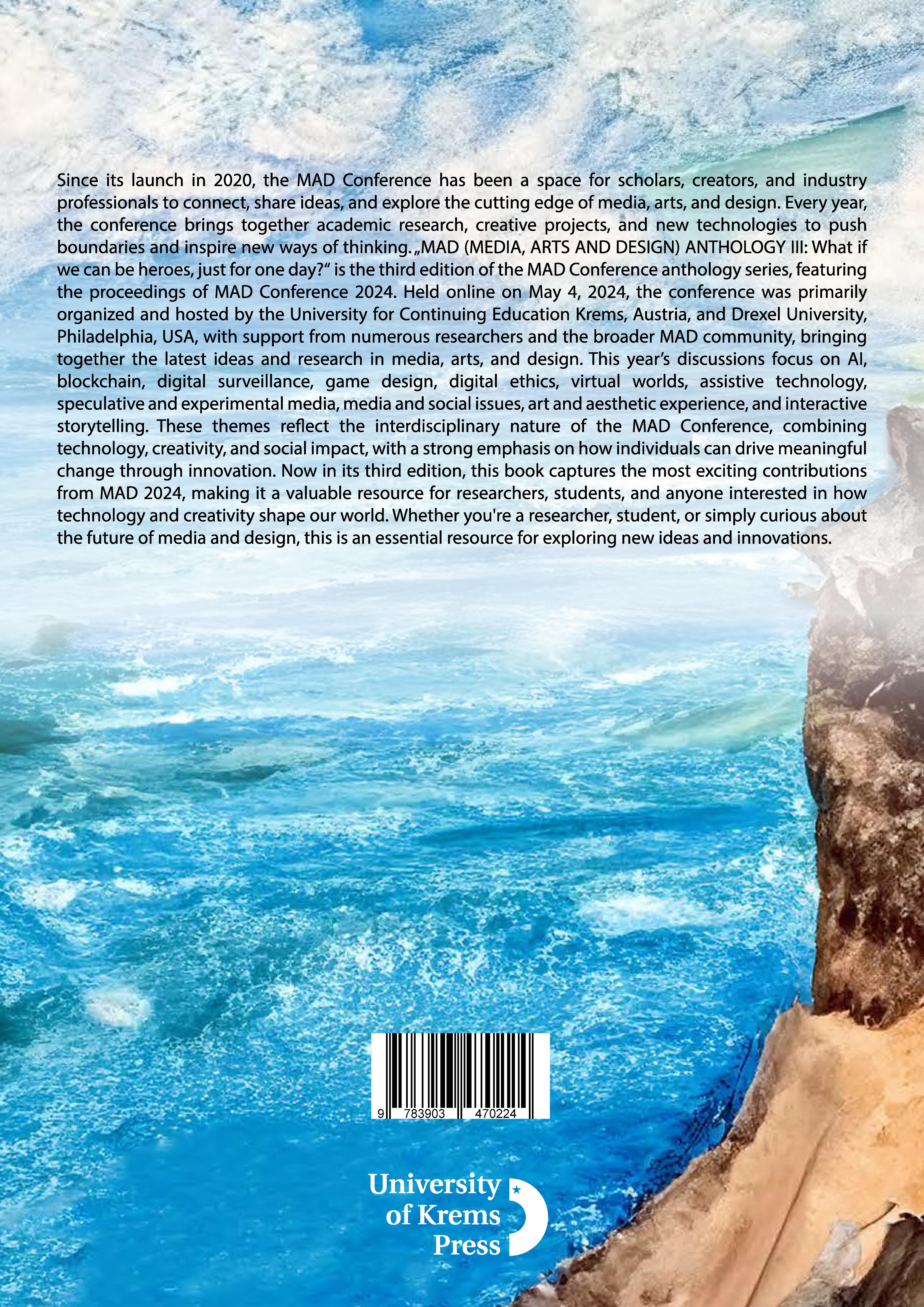 Since its launch in 2020, the MAD Conference has been a space for scholars, creators, and industry professionals to connect, share ideas, and explore the cutting edge of media, arts, and design. Every year, the conference brings together academic research, creative projects, and new technologies to push boundaries and inspire new ways of thinking. *MAD (MEDIA, ARTS AND DESIGN) ANTHOLOGY III: What if we can be heroes, just for one day?* is the third edition of the MAD Conference anthology series, featuring the proceedings of MAD Conference 2024. Held online on May 4, 2024, the conference was primarily organized and hosted by the University for Continuing Education Krems, Austria, and Drexel University, Philadelphia, USA, with support from numerous researchers and the broader MAD community, bringing together the latest ideas and research in media, arts, and design. This year's discussions focus on AI, blockchain, digital surveillance, game design, digital ethics, virtual worlds, assistive technology, speculative and experimental media, media and social issues, art and aesthetic experience, and interactive storytelling. These themes reflect the interdisciplinary nature of the MAD Conference, combining technology, creativity, and social impact, with a strong emphasis on how individuals can drive meaningful change through innovation. Now in its third edition, this book captures the most exciting contributions from MAD 2024, making it a valuable resource for researchers, students, and anyone interested in how technology and creativity shape our world. Whether you're a researcher, student, or simply curious about the future of media and design, this is an essential resource for exploring new ideas and innovations.