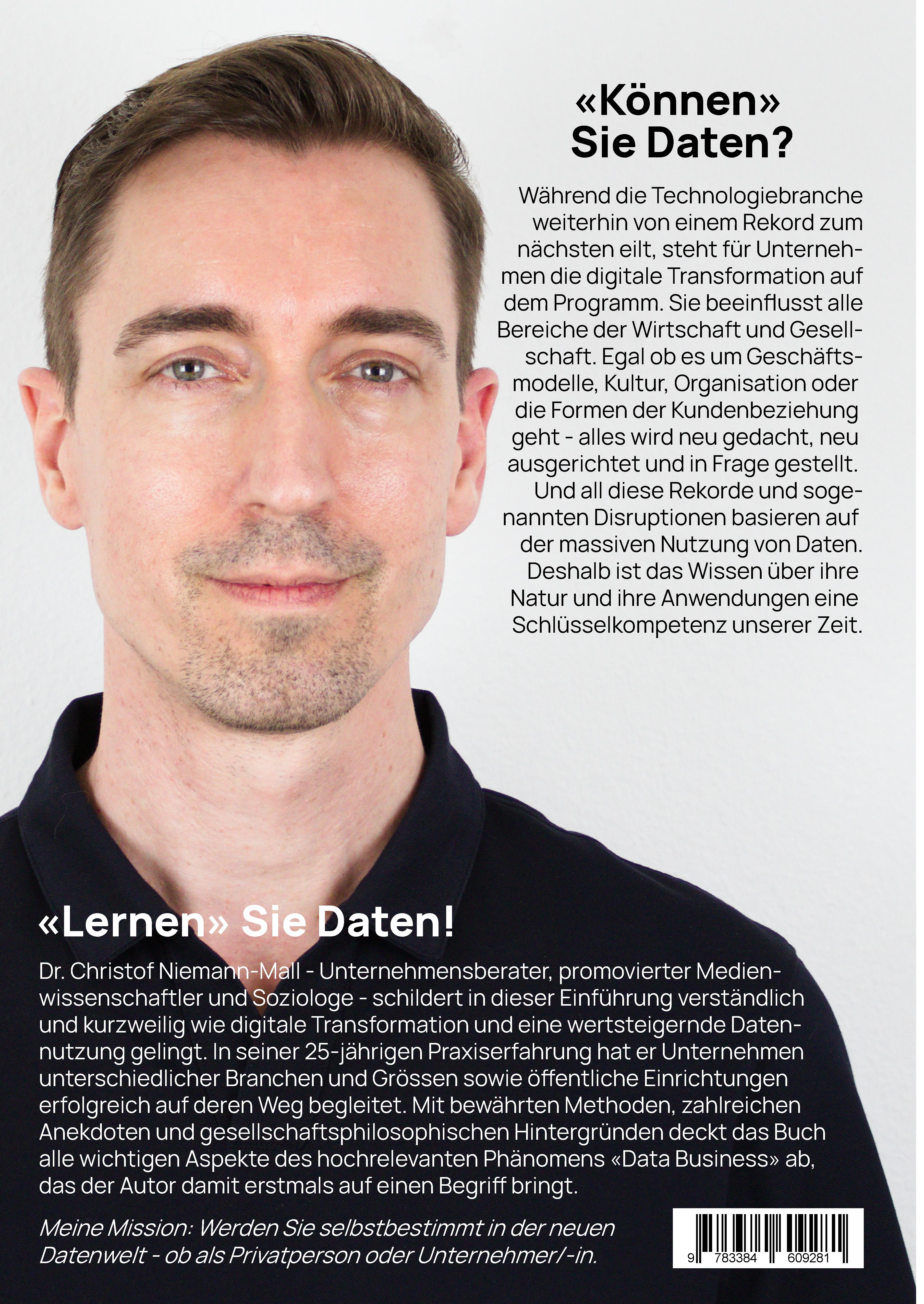 ➤➤➤ Dr. Christof Niemann-Mall ist digitaler Vordenker, Autor und erfahrener Unternehmensberater für digitale Transformation. Mit seiner interdisziplinären Expertise unterstützt er Organisationen dabei, datengetriebene Geschäftsmodelle zu entwickeln und Digitalisierung ganzheitlich umzusetzen. ______________█ D I G I T A L N A T I V E ➤➤➤ Frühe Leidenschaft für Daten und digitale Kreativität: Sein Weg in die Datenwelt begann früh: Bereits mit 15 Jahren beschäftigte er sich intensiv mit digitaler Musikproduktion und Grafikdesign – zwei Felder, in denen Daten kreativ, strukturierend und produktiv wirken. Diese frühen Erfahrungen legten das Fundament für seine spätere Arbeit mit komplexen digitalen Systemen. ______________█ W I S S E N S C H A F T L E R ➤➤➤ Wissenschaftliche Fundierung in Datenanalyse und Medienintelligenz: Seine akademische Laufbahn führte ihn über ein Studium der Soziologie zu einer Promotion an der Schnittstelle von Medienwissenschaften und Computerlinguistik. In seiner Dissertation erforschte er die computergestützte Netzwerkanalyse großer Textmengen – ein Thema, das die Grundlagen moderner Datenwissenschaft und KI-gestützter Informationsverarbeitung vorwegnahm. ______________█ B E R U F S E R F A H R U N G ➤➤➤ Mit über 25 Jahren Berufserfahrung vereint er Forschung, Strategie und Praxis: von der universitären Analyse bis zur Leitung einer Geschäftsanalyse-Abteilung und der strategischen Beratung namhafter Unternehmen und öffentlicher Institutionen. Branchenübergreifend liegt sein Fokus stets auf der werthaltigen Nutzung von Daten – von der Datenstrategie über Architektur bis zur kulturellen Verankerung. ______________█ M I S S I O N ➤➤➤ Daten verstehen – als wirtschaftliche und gesellschaftliche Kraft: Dr. Niemann-Malls Ziel ist es, die Prinzipien datengetriebener Unternehmen und die transformative Kraft digitaler Technologien allgemein verständlich zu machen. Er zeigt, wie datenbasierte Entscheidungen nicht nur Effizienz schaffen, sondern auch gesellschaftliche Entwicklungen prägen – und warum digitale Mündigkeit für jede und jeden von uns essenziell ist. Mit seiner Arbeit leistet er einen Beitrag dazu, die Chancen der Digitalisierung mit Weitsicht zu nutzen. Ob in Organisationen, Bildung, Medien oder Verwaltung: Wer die digitale Transformation wirklich versteht, kann sie aktiv mitgestalten – und muss sie nicht nur ertragen. ______________█ A U T O R E N W E B S E I T E ➤➤➤ WWW.DATA-BUSINESS.INFO
