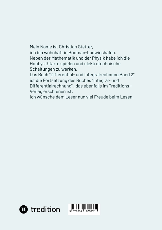 Ich heiße Christian Stetter und wohne in Bodman-Ludwigshafen. Seit fast einem Jahr teile ich mit 8 anderen Mitbewohner eine WG. In dieser WG werden ich und meine Mitbewohner seelisch betreut. Wir haben verschiedene Aktivitäten, die den Alltag struktuieren. Das hilft mir mein Tag zu gestalten. In der Freizeit beschäftige ich mich sehr viel mit Mathematik und moderner Physik. In der letzten Zeit habe ich - aber nur für mich - eine Abhandlung über die Mathematik geschrieben. Sie umfasst 11 Bände und beinhaltet alles wichtige der Mathematik: angefangen mit der Logik, Mengenlehre und vieles andere. Die Mathematik begleitet mich schon mein ganzes Leben! Schon in frühen Jahren las ich Artikel über die Relativitäts-Theorie, Quantenphysik und Astrophysik. Später kam dann das mathematische Verständnis der Formeln hinzu. In der Quantenphysik fasziniert mich das Plancksche Wirkungsquantuum und die Schrödinger-Gleichung, sowohl als Wellengleichung in einer oder drei Dimensionen. Auch finde ich die Heisenbergsche Unschärferelation intreressant. Kurz um, die theoretische Physik ist Teil meines Lebens geworden. Im Buch, das ihnen jetzt vorliegt, behandle ich die Analysis 2. Dieses Thema ist für das Verständnis der Mathematik als Grundlage wichtig. Neben der Integral- und Differentialrechnung ist die Analysis 2 entscheident.
