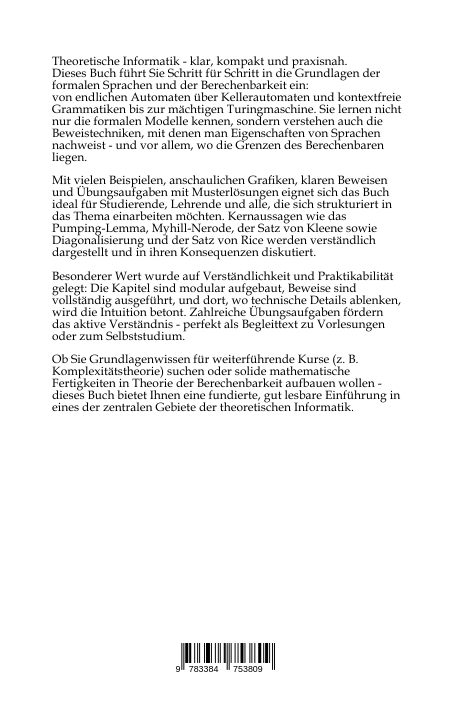 | Schlagworte | Algorithmen • Automatentheorie • Berechenbarkeit • Berechenbarkeitstheorie • Entscheidbarkeit • formale Sprachen • Kontextfreie Sprachen • reguläre Sprachen • Theoretische Informatik • Turingmaschinen |