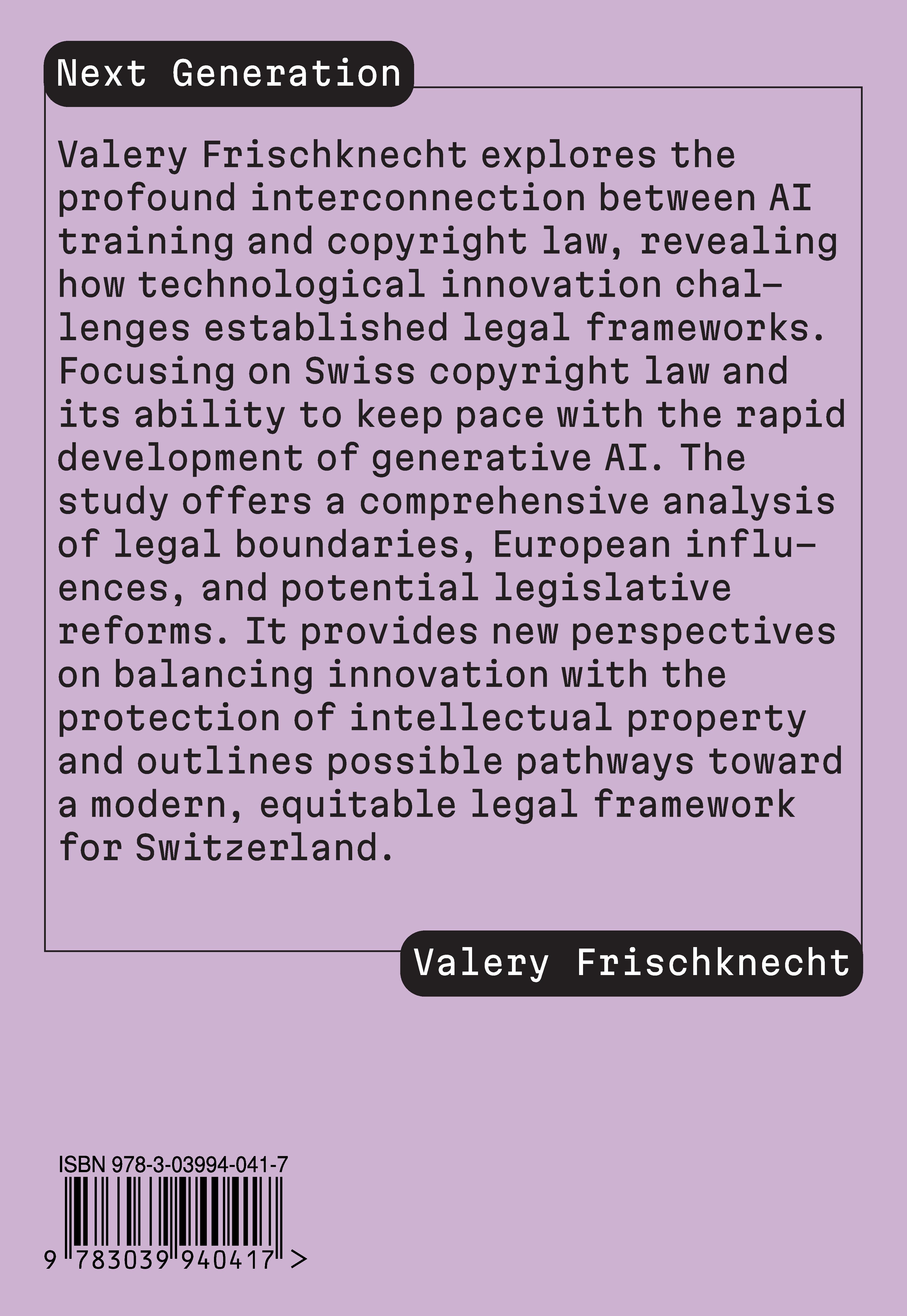 Valery Frischknecht explores the profound interconnection between AI training and copyright law, revealing how technological innovation challenges established legal frameworks. Focusing on Swiss copyright law and its ability to keep pace with the rapid development of generative AI. The study offers a comprehensive analysis of legal boundaries, European influences, and potential legislative reforms. It provides new perspectives on balancing innovation with the protection of intellectual property and outlines possible pathways toward a modern, equitable legal framework for Switzerland.