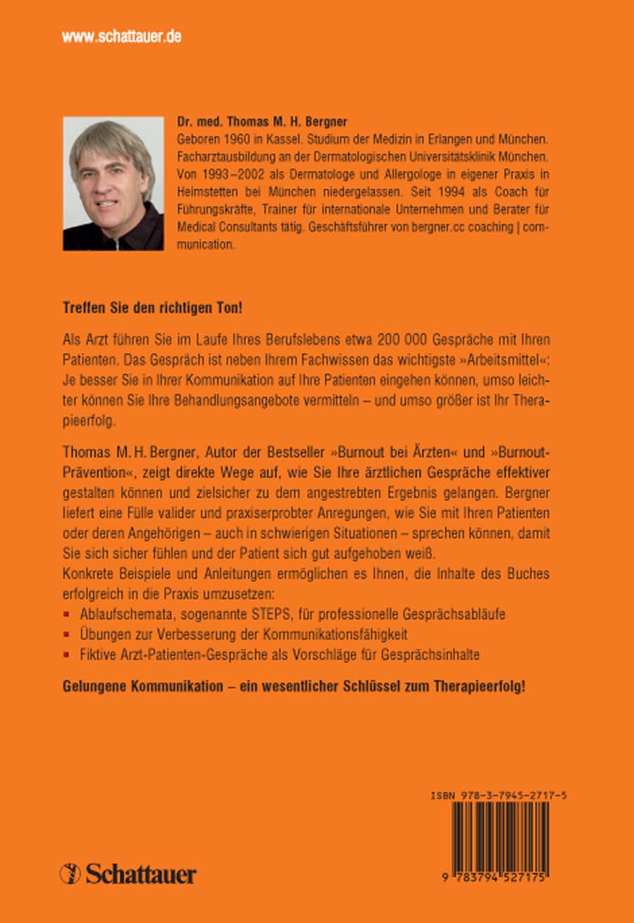 Thomas M. H. Bergner, Autor der Bestseller "Burnout bei Ärzten" und "Burnout-Prävention", zeigt konkrete Wege auf, wie Sie Ihre ärztlichen Gespräche effektiver gestalten können und zielsicher zu dem von Ihnen angestrebten Ergebnis gelangen. Anschaulich und spannend beschreibt er die Kommunikationsmöglichkeiten auf Seiten des Arztes in Verbindung mit einem neuen, von ihm entwickelten Kommunikationsmodell. Sie erhalten valide und praxiserprobte Anregungen, wie Sie mit Ihren Patienten oder deren Angehörigen - auch in schwierigen Situationen - sprechen können, damit Sie sich sicher fühlen und der Patient sich gut aufgehoben fühlt.