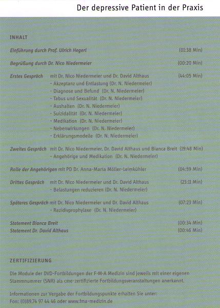 Diese Fachausgabe der F·M·A wurde als Video-DVD realisiert und kann praktikabel über den Video-DVD-Player oder mit dem DVD-Laufwerk des PC benutzt werden. Aus der Praxis für die Praxis konzipiert und lebendig veranschaulicht über Schauspielszenen und Rollenspiel, über Dialoge und Statements, werden kollegiale Tipps und Informationen zur Führung, zum Gespräch und im Umgang mit depressiven Patienten und den mitbetroffenen Angehörigen erteilt.