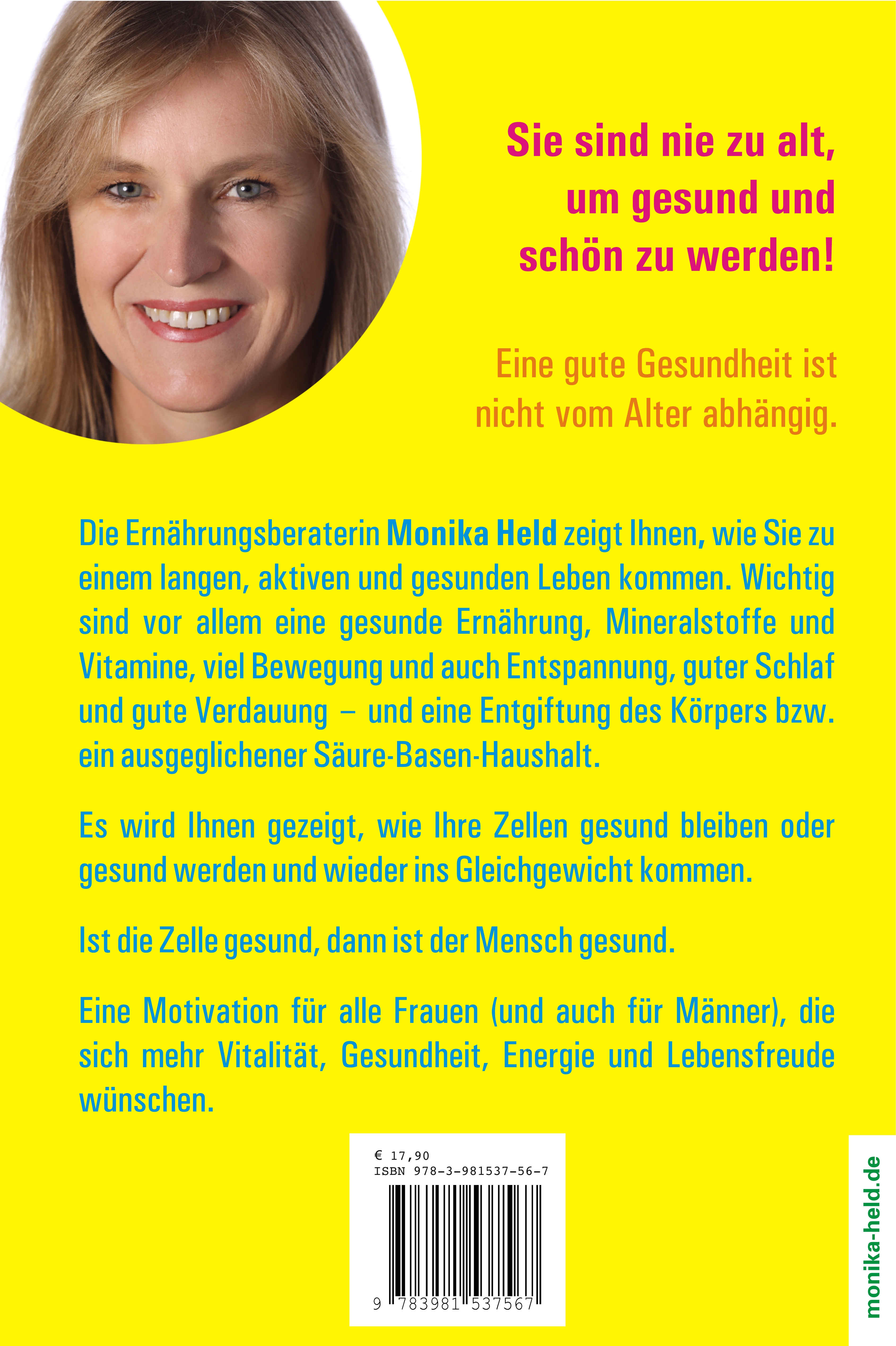 Eine gute Gesundheit ist nicht vom Alter abhängig. Monika Held zeigt Ihnen wie Sie zu einem langen, aktiven und gesunden Leben kommen. Wichtig sind vor allem eine gesunde Ernährung, Mineralstoffe und Vitamine, viel Bewegung und auch Entspannung, guter Schlaf und gute Verdauung und eine Entgiftung des Körpers bzw. ein ausgeglichener Säure-Basen-Haushalt.