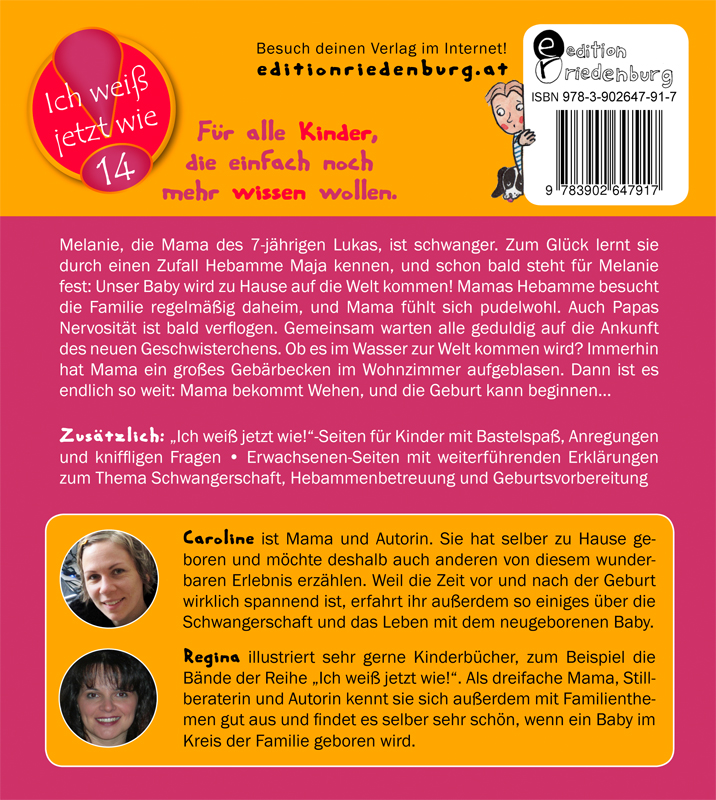 Wenn ein Baby unterwegs ist. . stellt sich für viele Mamas schon zu Beginn der Schwangerschaft die Frage, wo es zur Welt gebracht werden soll. Ein Baby bekommt man schließlich nicht alle Tage! Früher war es ganz normal, dass der Nachwuchs zu Hause das Licht der Welt erblickte. Es gab noch keine Krankenhäuser oder sie waren ganz weit weg. Auch heute ist es für viele werdende Mütter selbstverständlich, ihr Baby in den eigenen vier Wänden zu gebären. Denn bei einer Hausgeburt ist Mama die Chefin und gibt nicht nur bei den Wehen den Ton an. Falls eine Wassergeburt geplant ist, kann sogar mitten im Wohnzimmer ein Gebärbecken aufgestellt werden. Wenn das Baby dann zu Hause geboren ist, können alle Familienmitglieder mit ihm kuscheln und es liebhaben. Wie schön und wie gemütlich! Nicht selten wird auch die Hausgeburtshebamme eine bleibende Freundin. Sie betreut Mama in der Schwangerschaft, bei der Geburt und in der Zeit danach und weiß auf alle wichtigen Babyfragen eine Antwort. Da können sogar die Lehrer in der Schule noch etwas lernen… Viel Vergnügen beim Durchblättern, Anschauen und (Vor-)Lesen wünschen Caroline Oblasser & Regina Masaracchia
