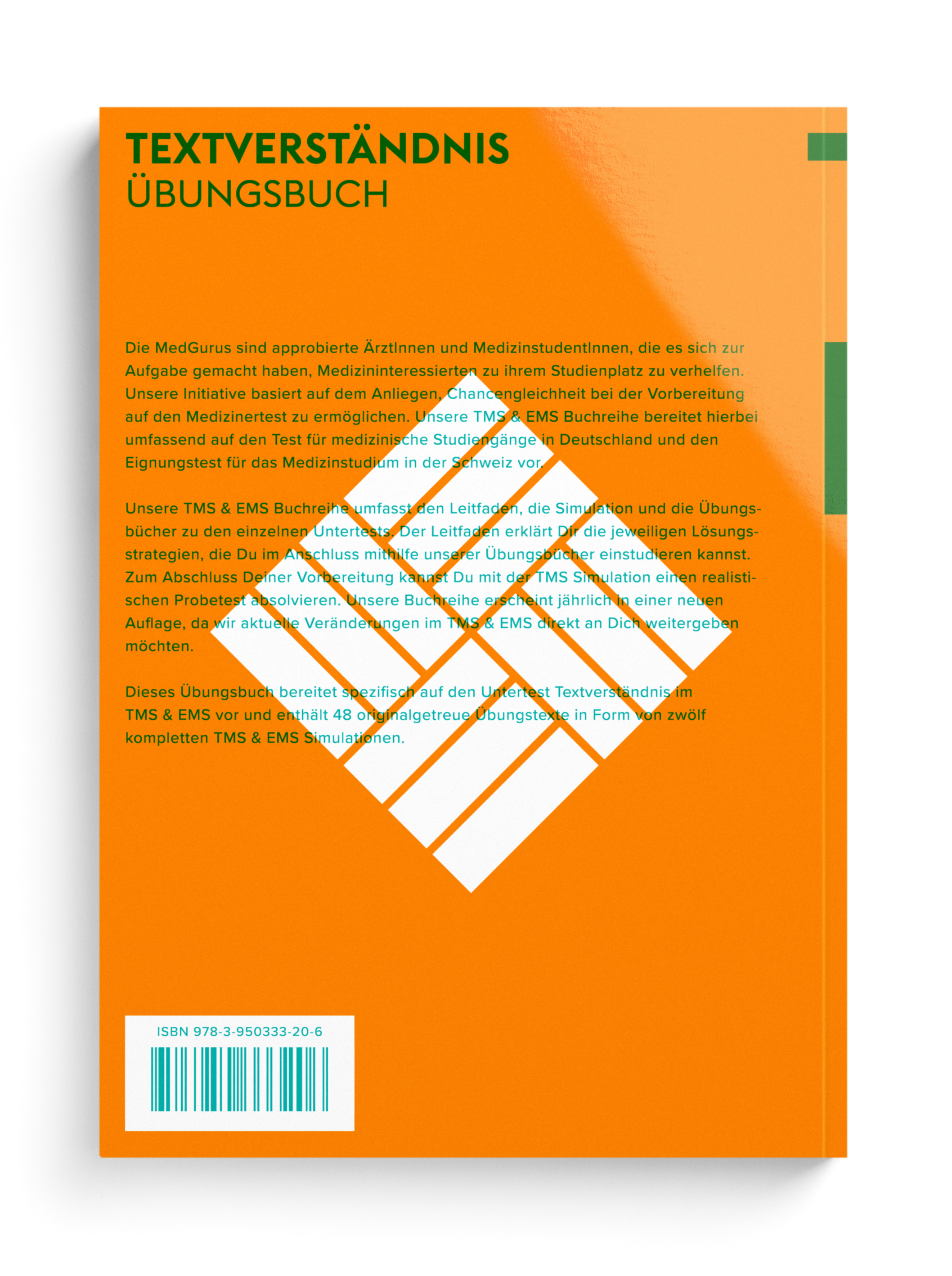 Das Übungsbuch Textverständnis bietet eine umfassende Vorbereitung auf den Untertest Textverständnis der Medizinertests TMS (Test für medizinische Studiengänge) in Deutschland und EMS (Eignungstest für das Medizinstudium) in der Schweiz. Das Übungsbuch enthält: