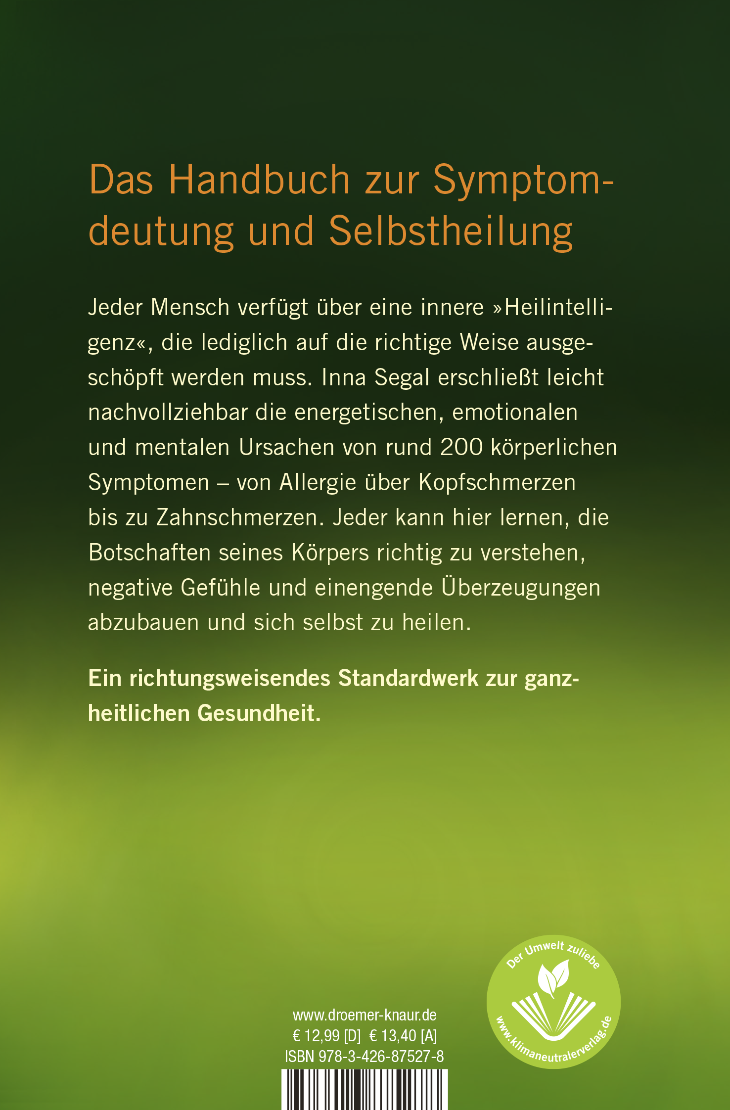 lt;p>Jeder Mensch verfügt über eine innere »Heilintelligenz«, die lediglich auf die richtige Weise ausgeschöpft werden muss. Inna Segal erschließt leicht nachvollziehbar die energetischen, emotionalen und mentalen Ursachen von rund 200 körperlichen Symptomen - von Allergie über Kopfschmerzen bis zu Zahnschmerzen. Jeder kann hier lernen, die Botschaften seines Körpers richtig zu verstehen, negative Gefühle und einengende Überzeugungen abzubauen und schließlich sich selbst zu heilen.