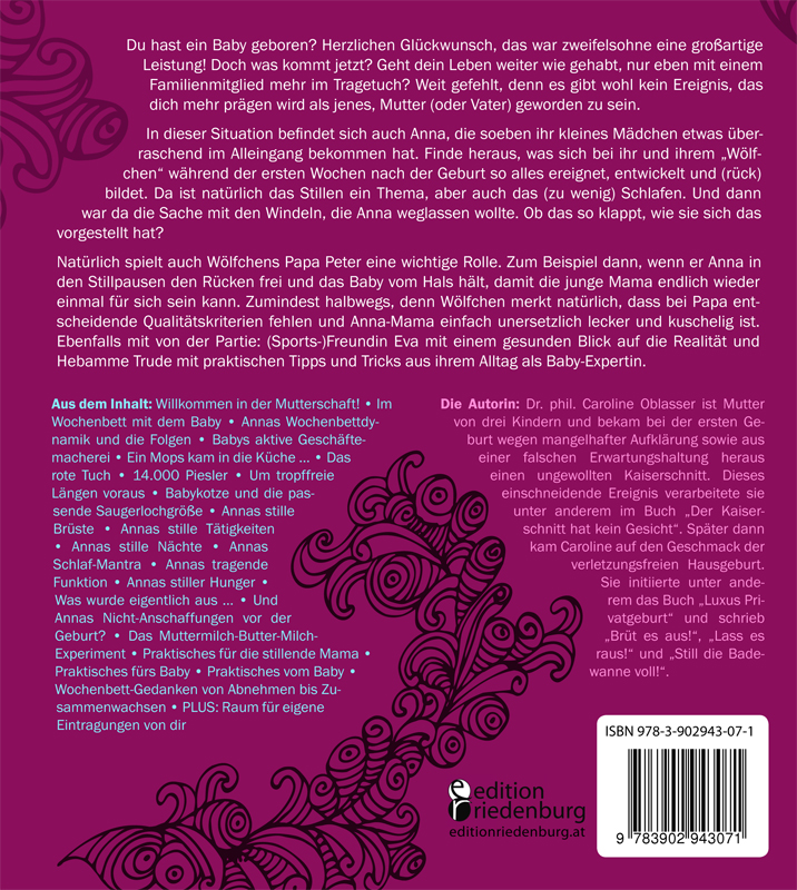 Die Autorin: Dr. phil. Caroline Oblasser ist Mutter von drei Kindern und bekam bei der ersten Geburt wegen mangelhafter Aufklärung sowie aus einer falschen Erwartungshaltung heraus einen ungewollten Kaiserschnitt. Dieses einschneidende Ereignis verarbeitete sie unter anderem im Buch „Der Kaiserschnitt hat kein Gesicht“. Später dann kam Caroline auf den Geschmack der verletzungsfreien Hausgeburt. Sie initiierte unter anderem das Buch „Luxus Privatgeburt“ und schrieb „Brüt es aus!“, „Lass es raus!“ und „Still die Badewanne voll!“.