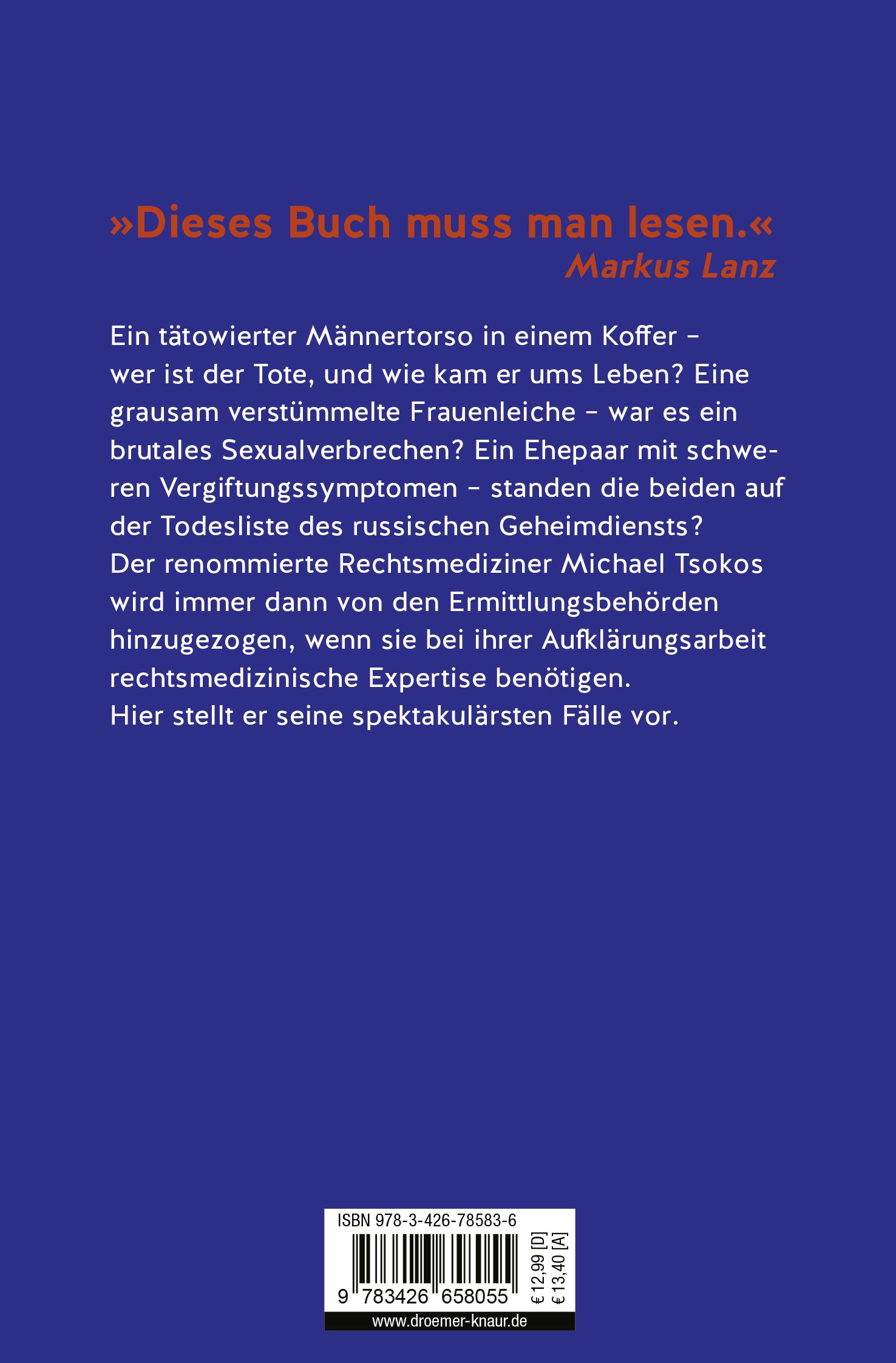 Prof. Dr. Michael Tsokos, 1967 in Kiel geboren, ist Professor für Rechtsmedizin und international anerkannter Experte auf dem Gebiet der Forensik. Seit 2007 leitet er das Landesinstitut für gerichtliche und soziale Medizin in Berlin. Seine bisher 28 Bücher sind allesamt Bestseller und wurden bereits mit hochkarätiger Besetzung verfilmt. Mit seinen bundesweiten Live-Events zu rechtsmedizinischen Themen fesselt er seit Jahren seine knapp 700 000 Follower auf Instagram, seine Fans, Leser und Zuschauer.@dr.tsokos