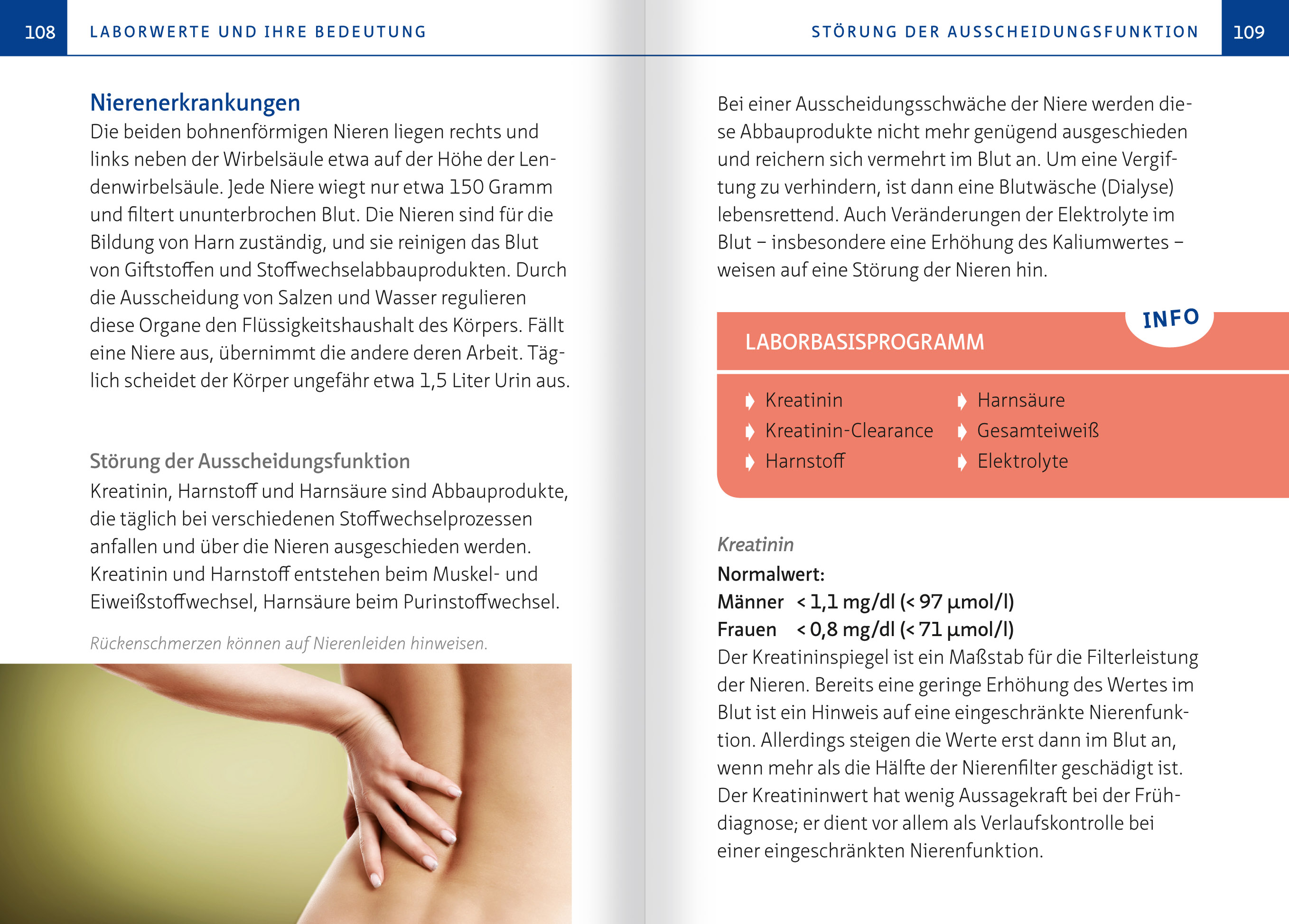 INHALTVorwortLABORWERTE UND IHRE BEDEUTUNGDas Blut- Die Blutentnahme- Was sind Normalwerte?- Die Aufgaben des Blutes- Das Blutbild - Die BlutgerinnungMineralstoffe und Spurenelemente- Mineralstoffe (Elektrolyte)- Spurenelemente Vitamine- Im Blut erkennbarDas Hormonsystem- Organe, die Hormone produzieren- Hormone in der Laboruntersuchung Das Immunsystem- So funktioniert unsere Abwehr- Wie der Körper Freund und Feind unterscheidet Der Stoffwechsel- Der Fettstoffwechsel - Der Zuckerstoffwechsel - Die Harnsäure - Der EiweißstoffwechselKörperliche Störungen oder Organerkrankungen- Das AB0-Blutgruppensystem- Verschiedene Krankheiten des Blutes - Die Leber - eine »chemische Fabrik«- Herzinfarkt und Herzerkrankungen - Nierenerkrankungen- Erkrankungen von Magen, Bauchspeicheldrüse und Darm - Nachweis von Entzündungen - Nachweis von Rheumaerkrankungen/Autoimmunerkrankungen- Nachweis von Allergien im Labor - Erkennen von Tumorerkrankungen DAS WICHTIGSTE AUF EINEN BLICKExtra: die wichtigsten Laborwerte Übersicht LaborbasisprogrammMaßeinheiten und GewichteRegister Literatur