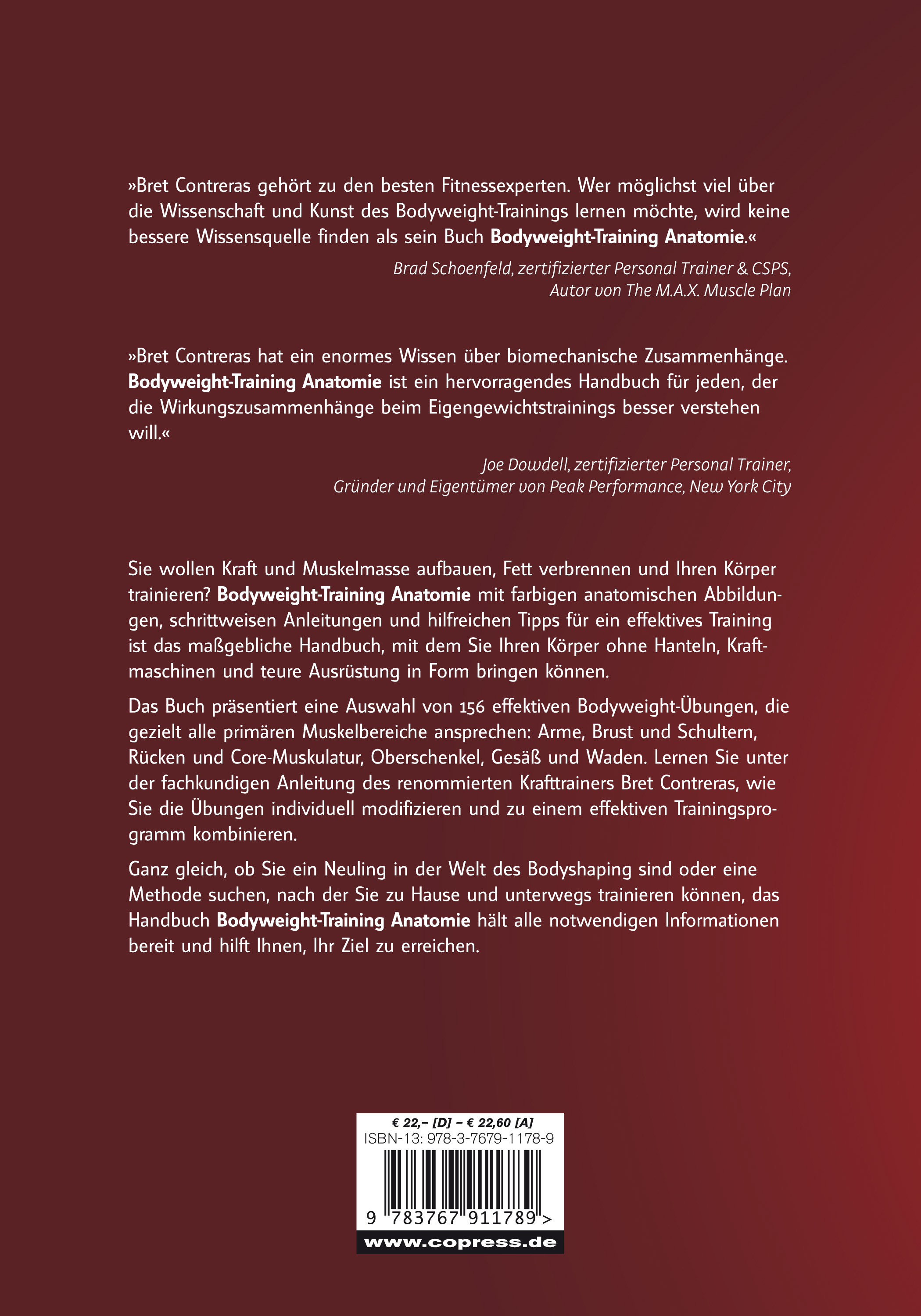 »Des Personaltrainer und Fitnessexperte Bret Contreras legt hier ein weiteres Buch zum derzeit sehr populären Eigengewichtstraining vor. Ohne die sonst üblichen längeren Einleitungen geht es schnell zum Kern des Buches: der ausführlichen Beschreibung von Eigengewichts-Übungen für alle wichtigen Körperteile. Unterteilt in die Kapitel Arme, Nacken und Schultern, Brust, Core, Rücken, Oberschenkel, Gesäß, Waden und Ganzkörpertraining werden ca. 80 Übungen und ihre Varianten vorgestellt. Wie in ähnlichen Büchern des Verlages (vgl. z.B. "Bodybuilding Anatomie" oder "Core-Training Anatomie") werden in detaillierten Zeichnungen jeweils die Muskelgruppen dargestellt, die gerade trainiert werden. Alle Übungen sind nach ihrem Schwierigkeitsgrad gekennzeichnet, ob sie für Einsteiger, leicht oder weiter Fortgeschrittene oder Profis geeignet sind.«