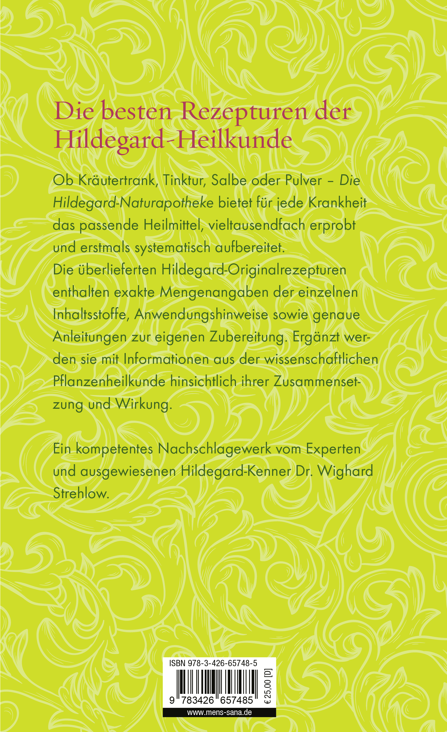 "Die Hildegard-Naturapotheke" ist eine erweiterte und detailliertere Fassung des "Hildegard- Kompasses" für all diejenigen, die noch tiefer in die Materie einsteigen wollen. Die überlieferten Originalrezepturen enthalten zusätzlich exakte Mengenangaben der einzelnen Inhaltsstoffe sowie genaue Anleitungsschritte, damit jeder die Mittel auch zu Hause selbst zubereiten kann. Alle enthaltenen Rezepte haben sich in der über 30-jährigen Praxis von Wighard Strehlow vieltausendfach bewährt. Ergänzt sind sie jeweils durch viele pflanzenkundliche und wissenschaftliche Details hinsichtlich ihrer Zusammensetzung und Wirkung.