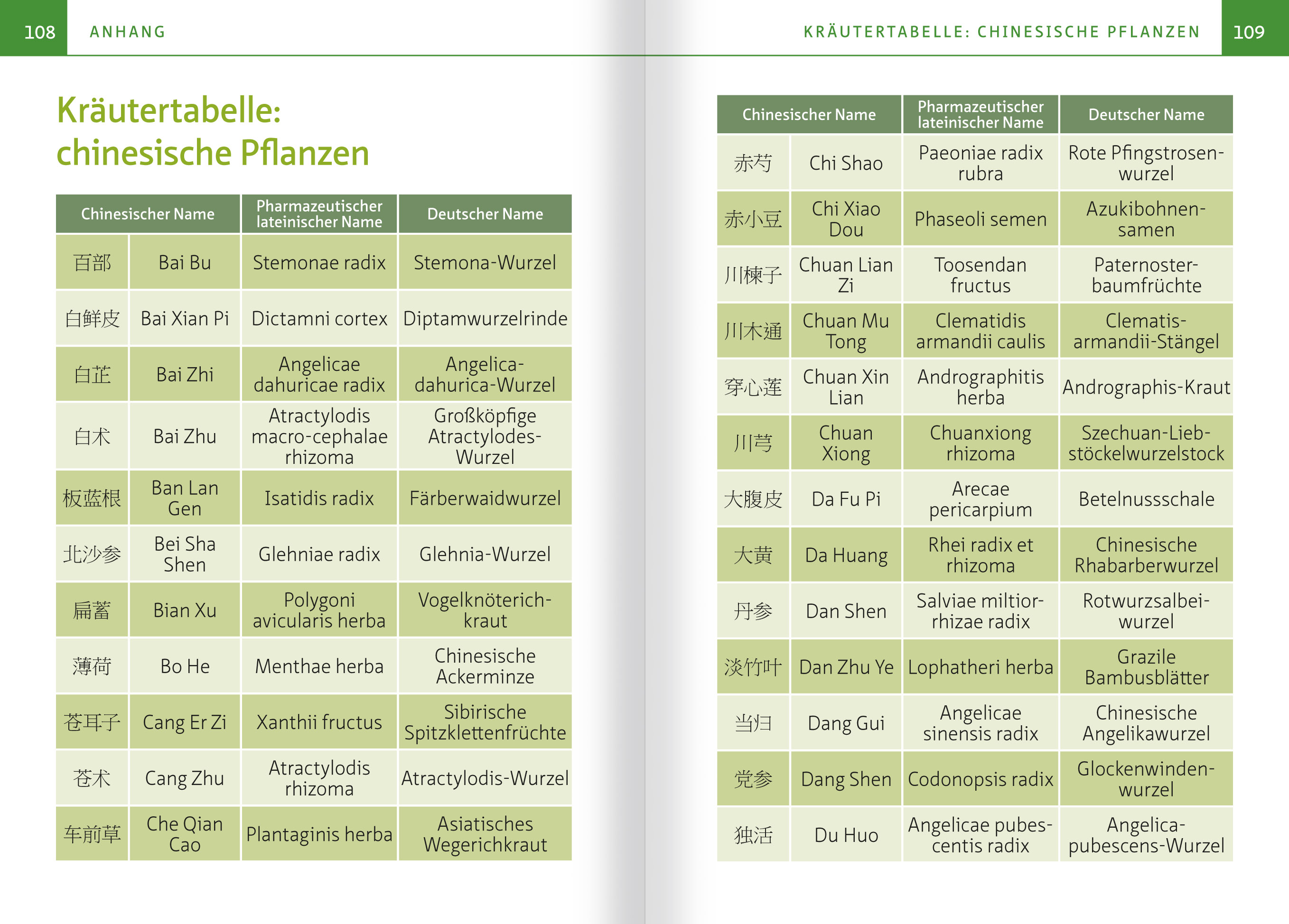 INHALTEinleitung EINFÜHRUNG IN DIE KRÄUTERHEILKUNDE Die Kräuterheilkunde in der TCM - Der Mensch im Gesamtgefüge der Natur und des Kosmos - Krankheitsauslösende Faktoren - Die Diagnose in der TCM - Die fünf Behandlungssäulen - Die chinesische Kräuterheilkunde in der Praxis Die europäische Kräuterheilkunde - Von der Antike bis zur Epoche der Klostermedizin - Die moderne Entwicklung - Phytotherapie und Schulmedizin - Synergien zwischen Ost und West Die wichtigsten pflanzlichen Wirkstoffe - Wirkstoffgruppen und Wirkstoff e Rezepturen - Zubereitung und Dosierung TEEREZEPTUREN FÜR ERWACHSENE Akne Arthritis Arthrose Augenentzündung BlähungenBlasenentzündung Blutdruck, hoch Blutdruck, niedrig /Durchblutungsstörungen Bronchitis Depressive Verstimmungen Durchfall Ekzem (Dermatitis) Erschöpfung FurunkelGicht Grippaler InfektHaarausfall Hämorrhoiden Heuschnupfen Husten Krampfadern Magenschmerzen Menstruation, schmerzhaft (Dysmenorrhö) Muskelkater Nebenhöhlenentzündung (Sinusitis) Nervosität Neurodermitis Ödeme (Wasseransammlungen) Osteoporose Potenzstörungen Prämenstruelles Syndrom (PMS) Reizblase Rheumatische Beschwerden Schlafstörungen Schnupfen Schwindel Übergewicht Venenentzündung Verstopfung Wechseljahresbeschwerden TEEREZEPTUREN FÜR KINDER Albträume Angstzustände Appetitlosigkeit Bauchschmerzen Bettnässen (Enuresis) Blasenentzündung Grippaler Infekt Hals- und MandelentzündungHeuschnupfen Konzentrationsschwäche Kopfdruck/Kopfschmerz Kreislaufschwäche Prüfungsangst Stottern Übelkeit und Brechreiz WachstumsbeschwerdenANHANG Kräutertabelle: Chinesische Pflanzen Kräutertabelle: Europäische Pflanzen Bezugsquellen Kräuterschulen Volksheilkundliches KräuterwissenRegister